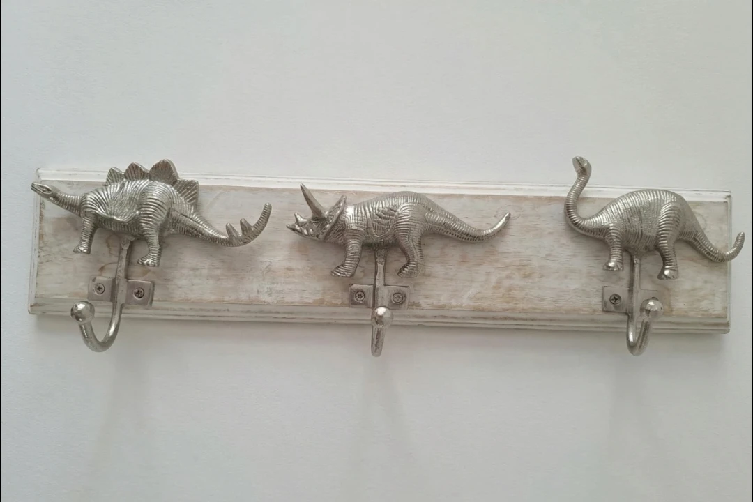 Here's a fun dinosaur wall-mounted coat rack. It's perfect for a kid's room, and for adults, too! Or any space where you want to add a touch of whimsy.