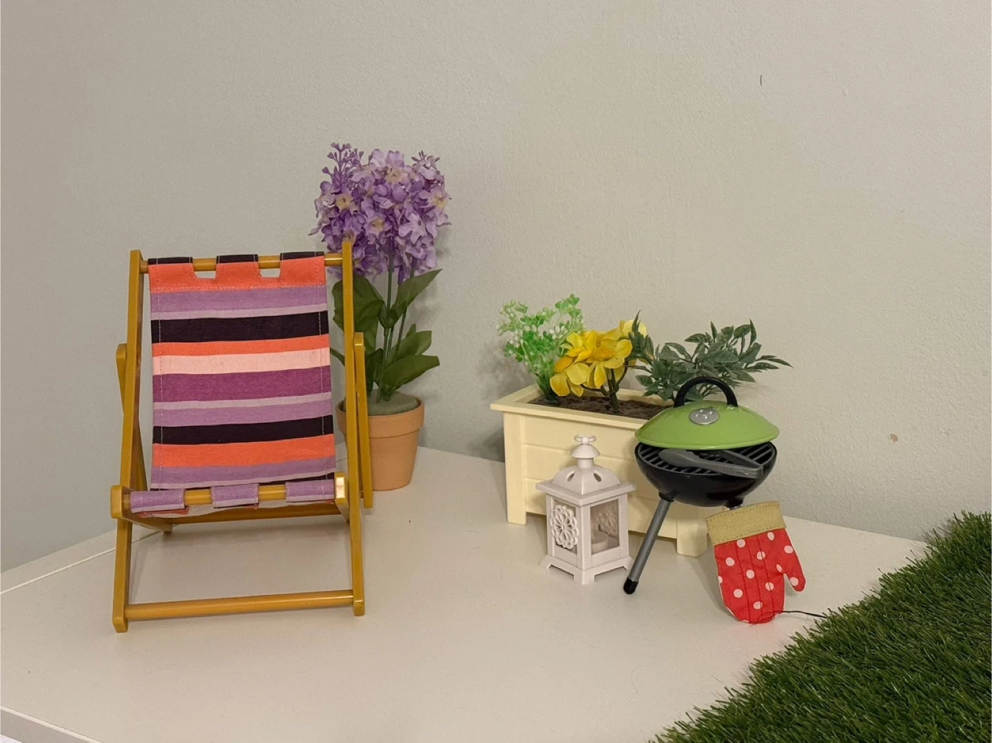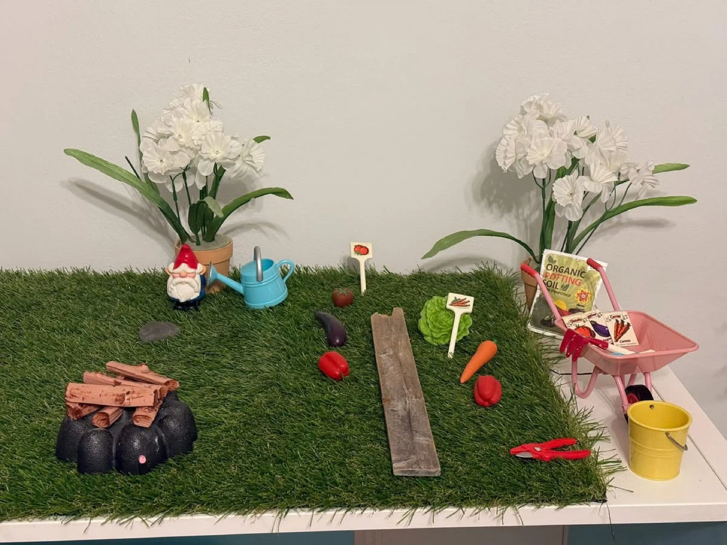 It’s decorated, comes with 2 bedrooms, 1 bathroom (bath makes water noises), living room furniture & plant, full garden/bbq/ veggie garden) and lights (batt not included as these are rechargeable).