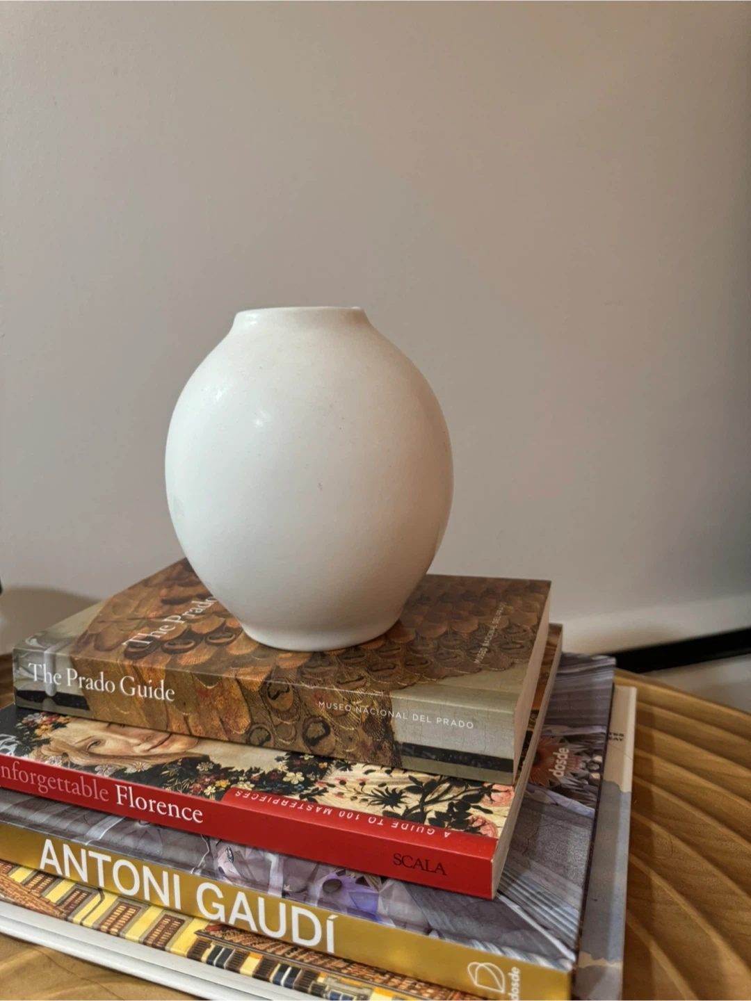 A simple, round vase in white. Perfect for adding a touch of minimalist elegance to any room. It's in great condition and ready to display your favourite flowers or greenery