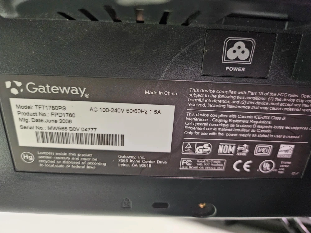 Selling a Gateway FPD1780 17" LCD monitor. It has a 17" viewable image size and an adjustable stand. The manufacturing date is June 2006. Model number: TFT1780PS