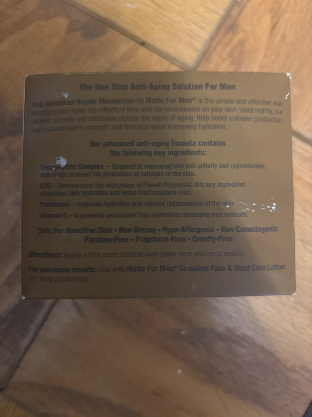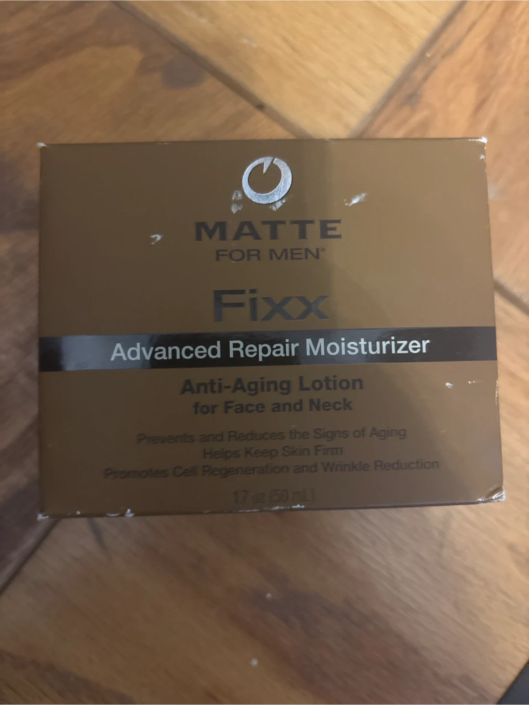 Selling a Matte For Men Fixx Advanced Repair Moisturizer. It's an anti-aging lotion for face and neck, and it prevents and reduces the signs of aging. This moisturizer also helps keep skin firm and promotes cell regeneration and wrinkle reduction. It comes in a 1.7 oz (50 ml) size. It's safe for sensitive skin, non-greasy, hypo-allergenic, non-comedogenic, paraben-free, fragrance-free, and cruelty-free. It’s brand new box is just a little stained from the outside. It’s never been opened or used.