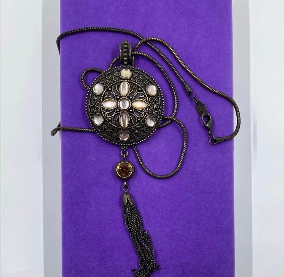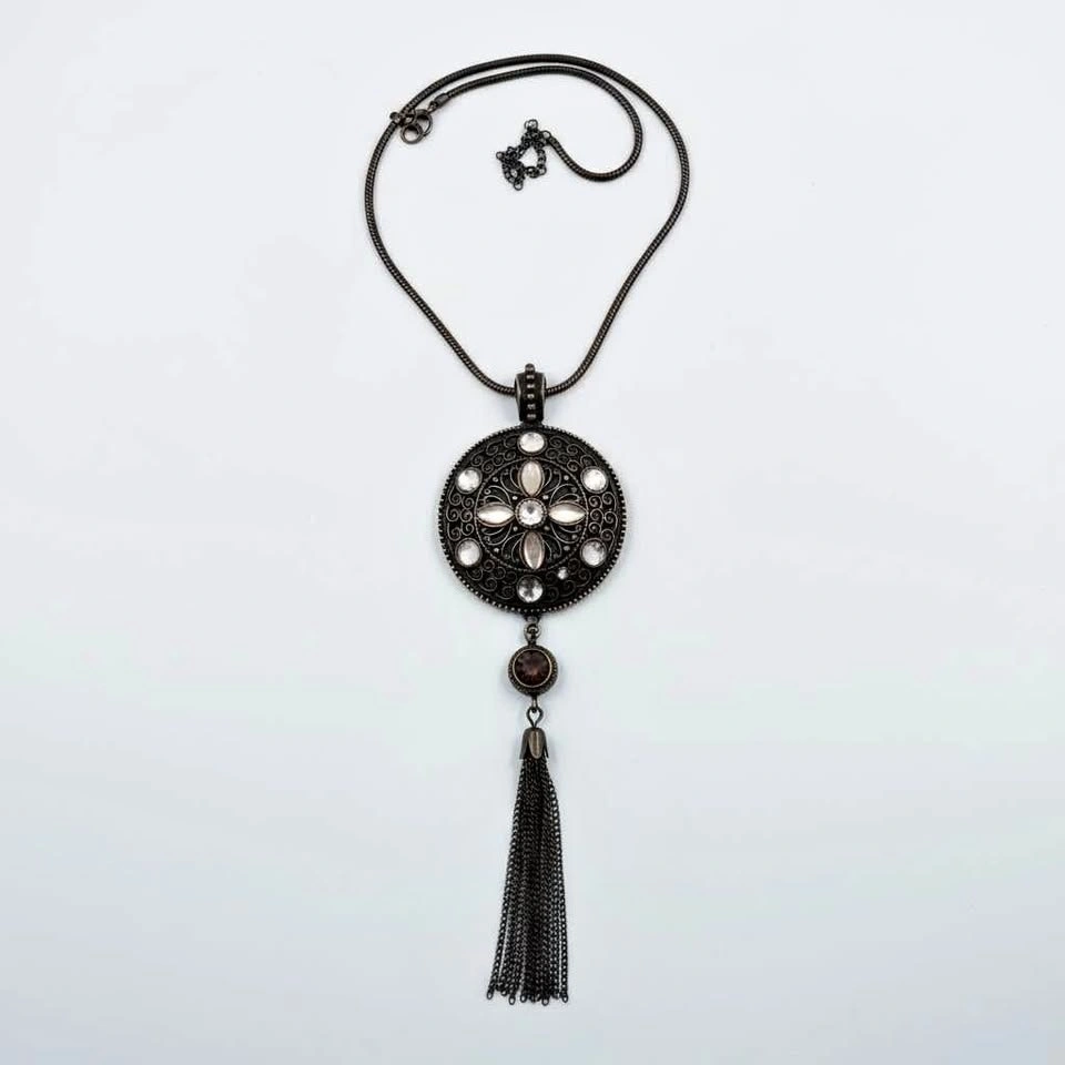 This classic vintage Avon necklace features a striking round pendant with ornate filigree detailing, set with luminous cabochon stones and a dramatic chain tassel drop. The pendant is approximately 3 inches in length. The necklace measures 25 inches and closes securely with a vintage-style clasp. This necklace retains its original “Avon” mark or tag. Condition is vintage/preloved with only minimal surface flaws typical of age, and all stones and findings are intact.