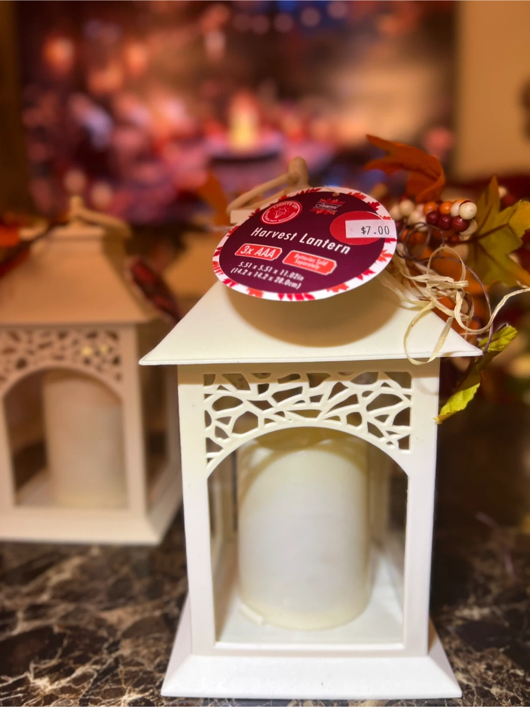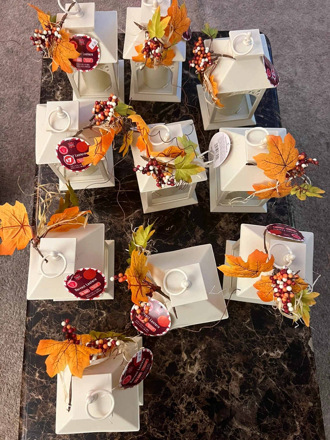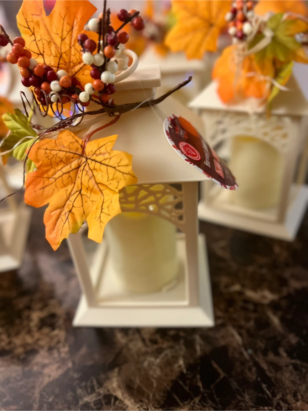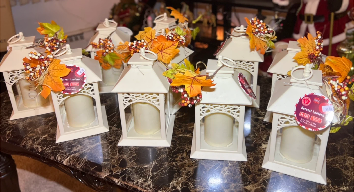 Add a touch of autumn charm to your home with these Harvest Lanterns! They come with a warm, inviting glow. The lanterns are decorated with fall leaves and berries for a festive look. Each lantern originally cost $7.00 . I have 10 of them for $20 all