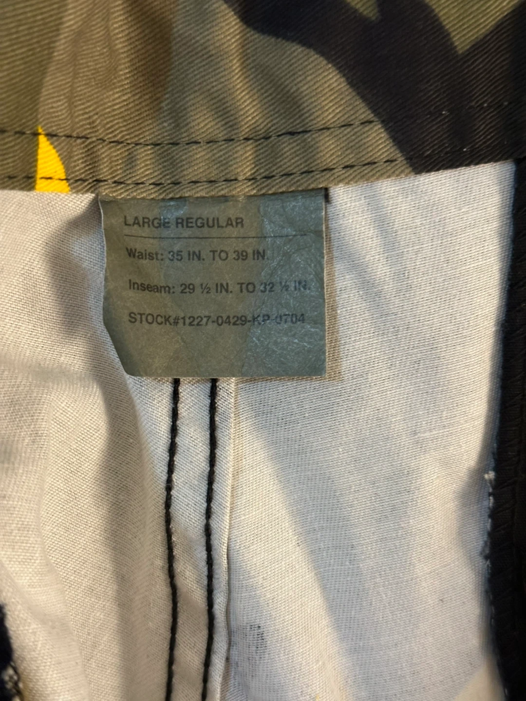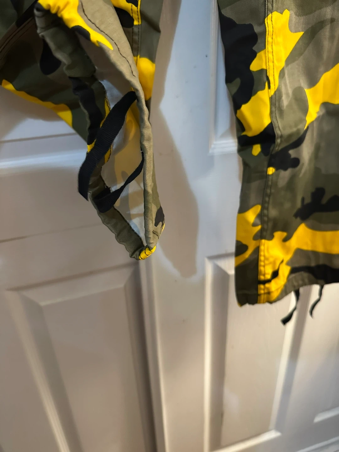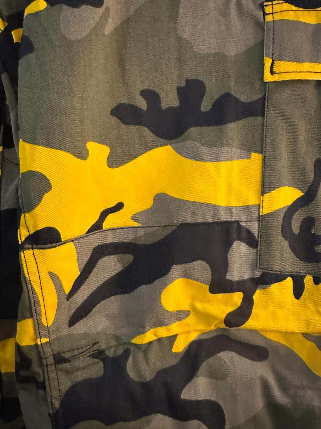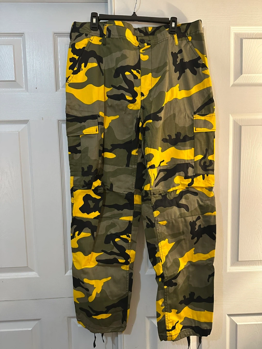 Selling a pair of camouflage cargo pants. These are size large and feature a cool yellow and black camo pattern.