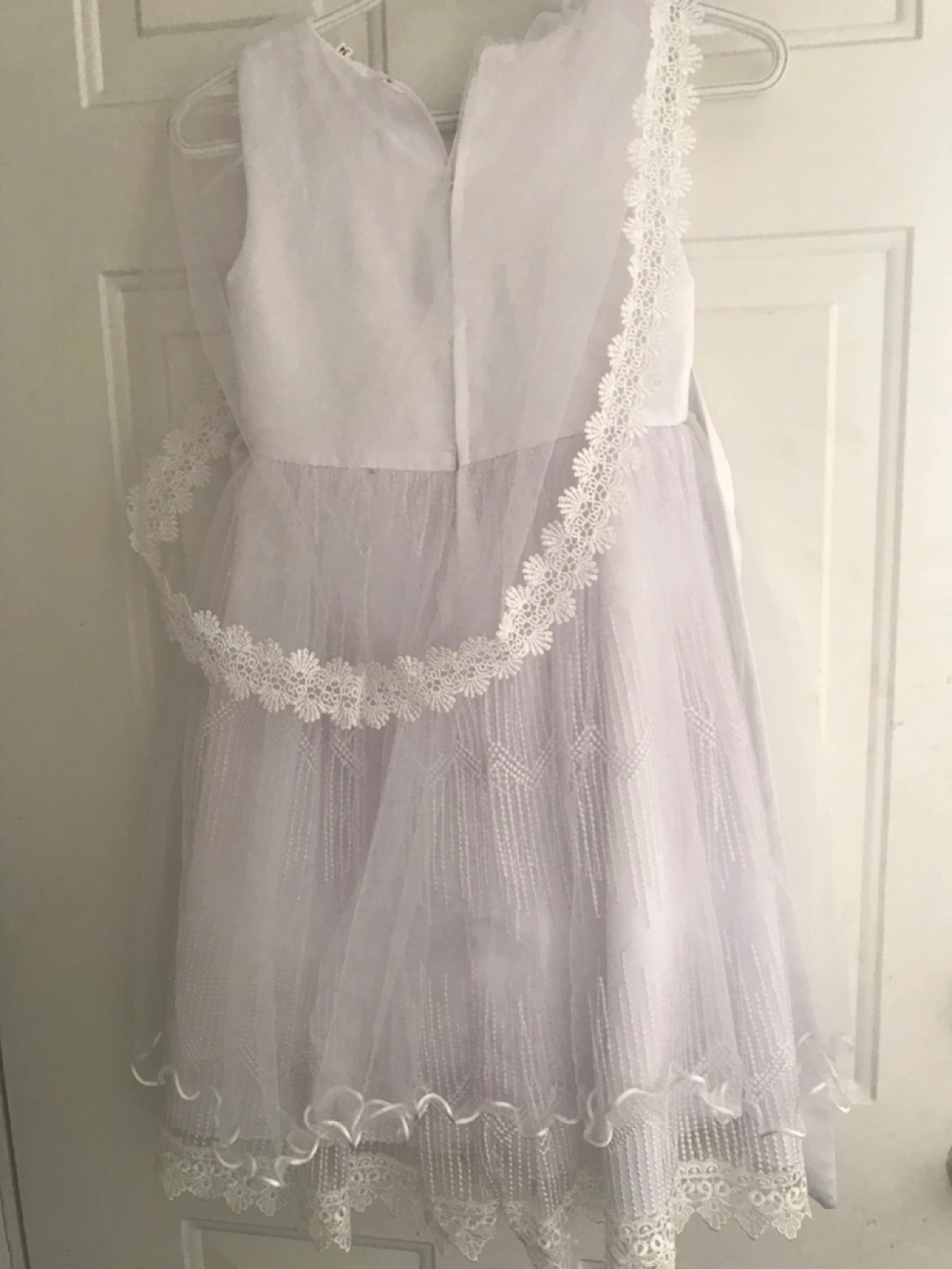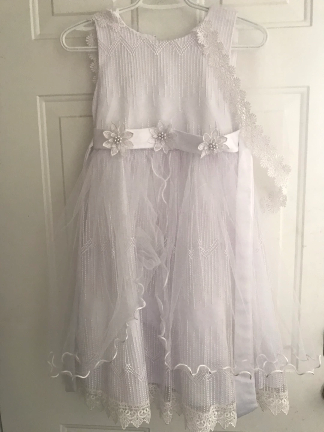 A beautiful white dress, perfect for a flower girl, church or special occasion. It features delicate lace detailing and a lovely flower embellishment on the waist. It's in great condition and ready to make your little one shine! Size 34– can fit 4-8 depending on the size of your kiddo!