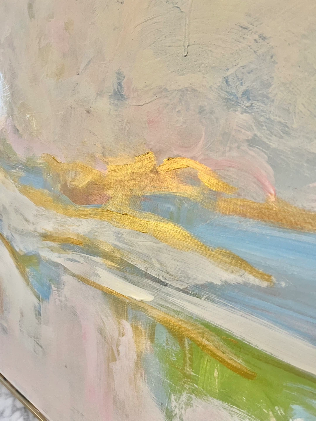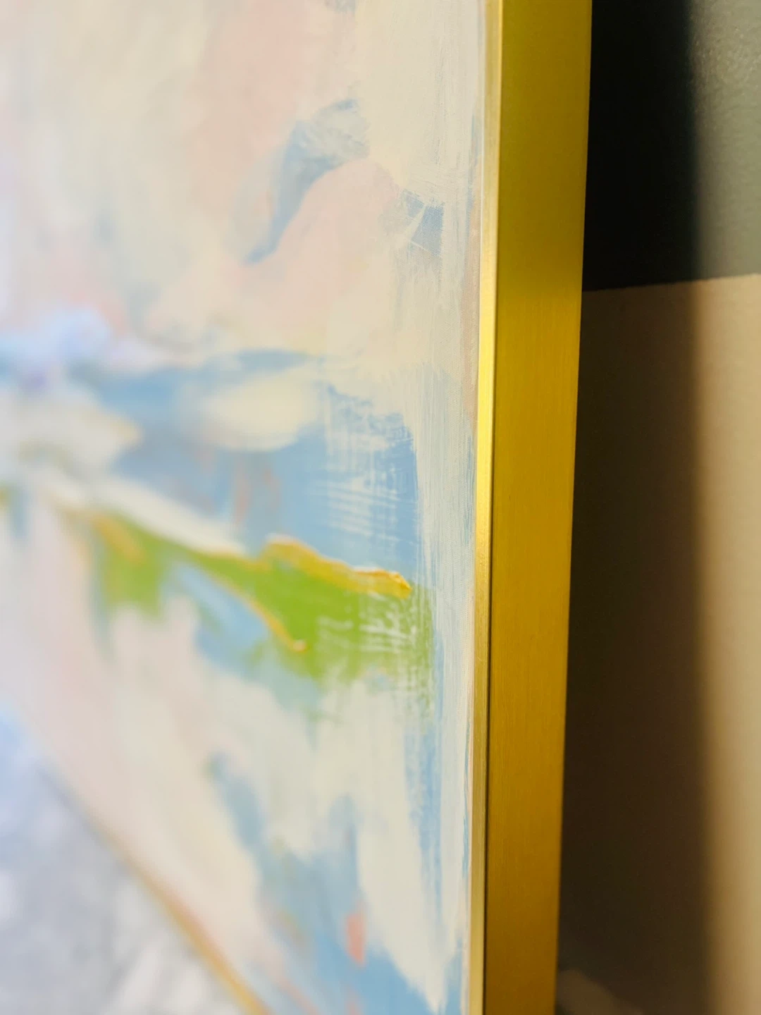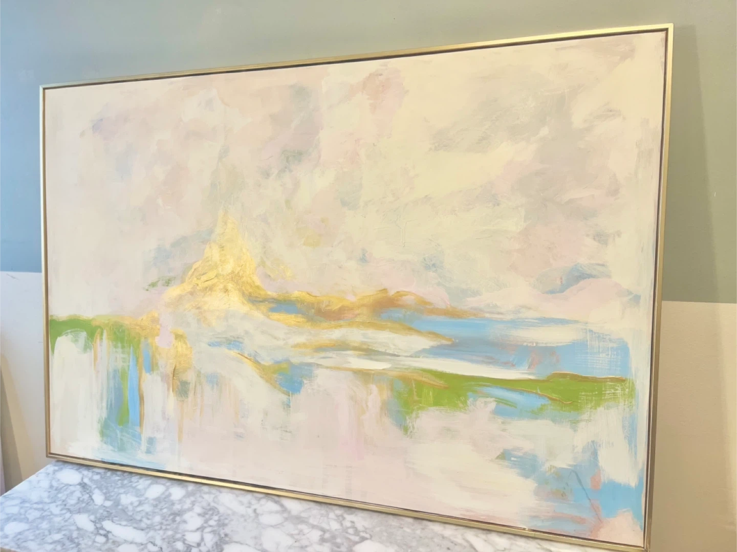 Selling a beautiful abstract painting with a gold frame 32” x 48” with a modern gold floater frame. The painting features soft colours and a striking gold accent. It would be a great addition to any room!