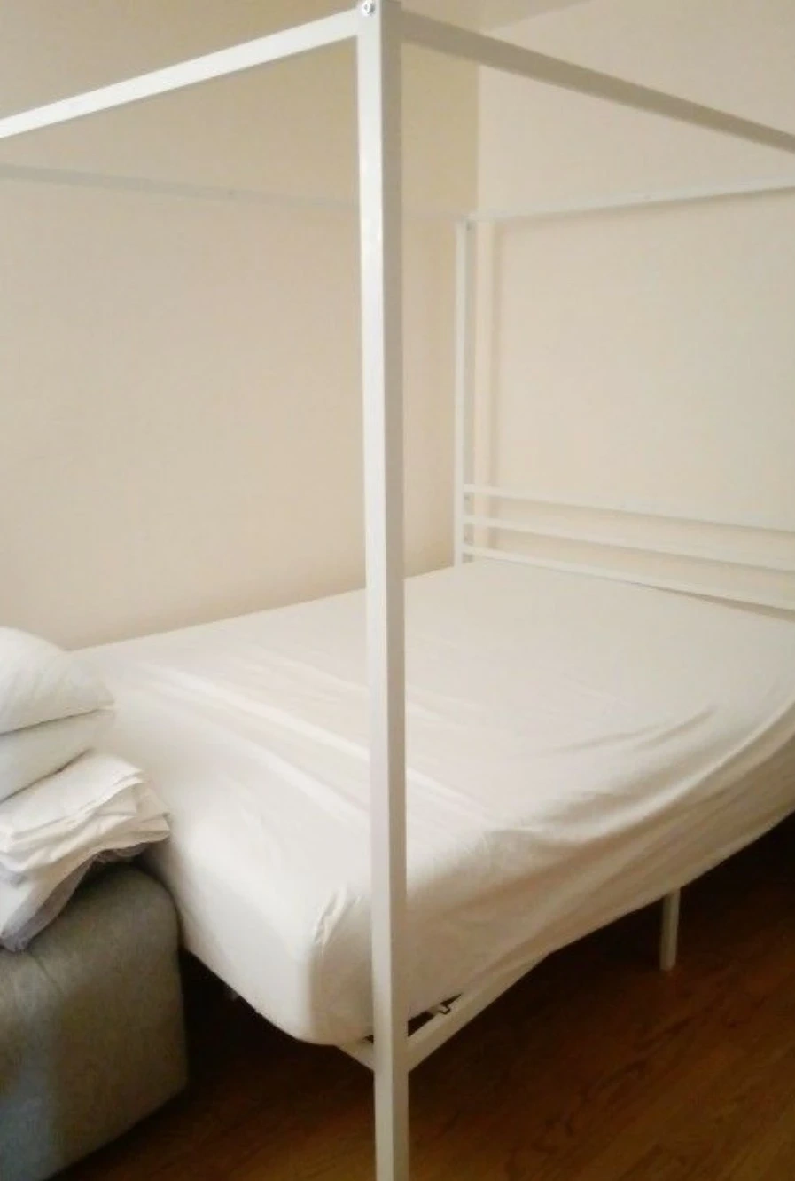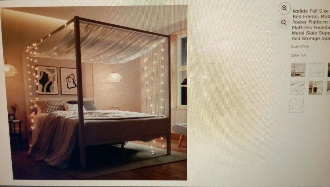 Selling a full-size white canopy bed frame by Ikalido. It's a poster platform bed with metal slats support. Perfect for adding a touch of elegance to your bedroom!