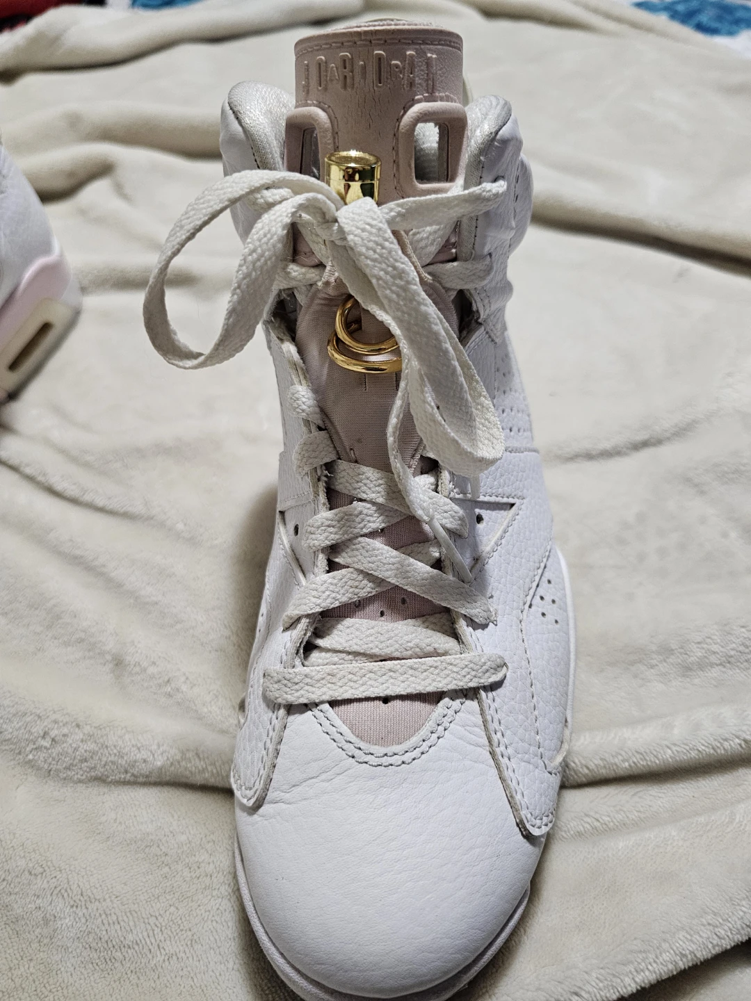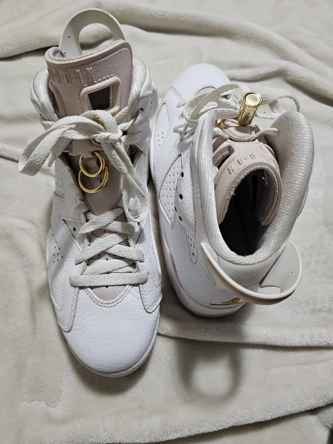 Selling a pair of Air Jordan 6 Retro sneakers in white and pink. They're in almost new condition and ready for a new owner! Size 8