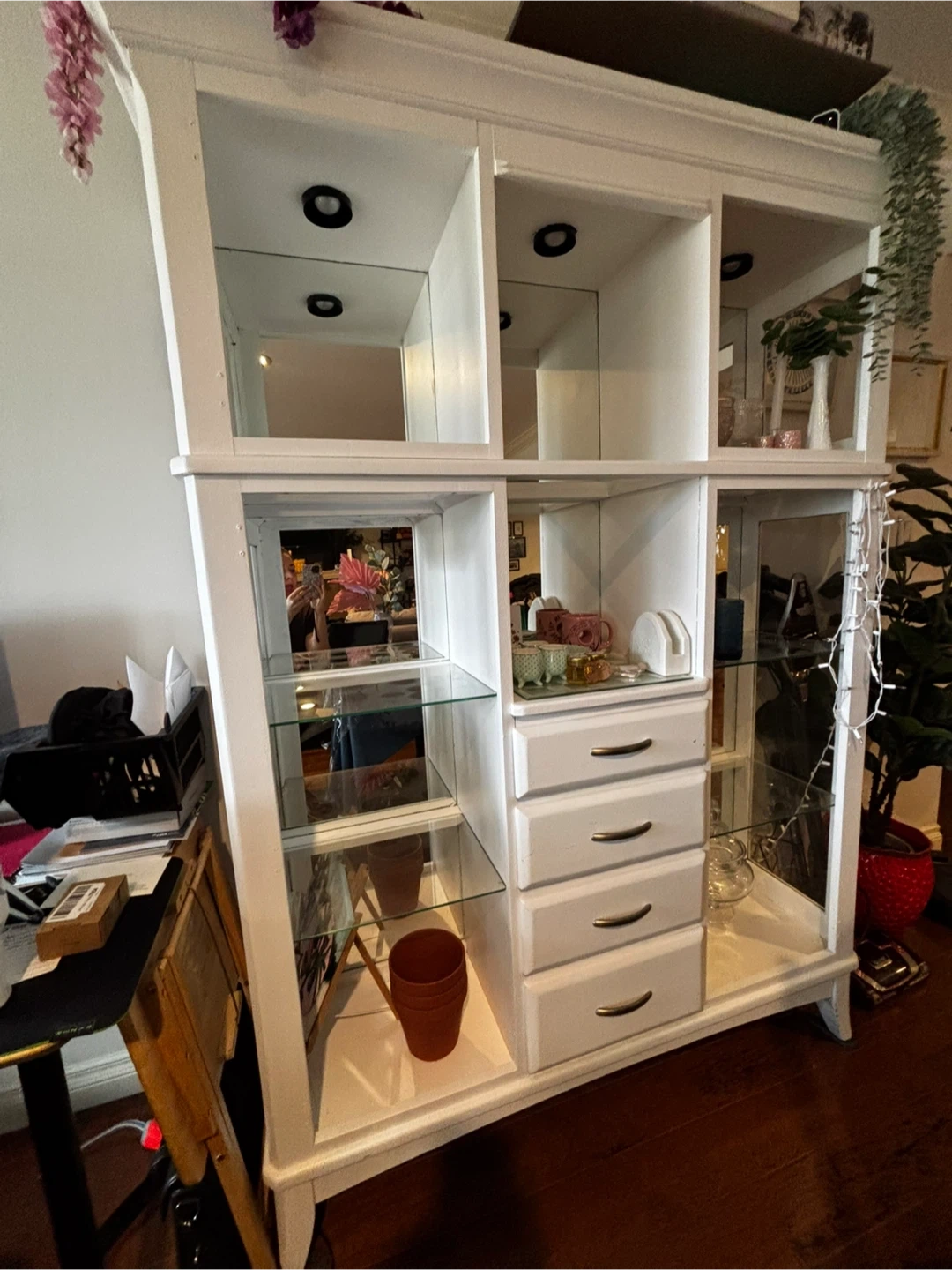Selling a lovely white display cabinet! It comes apart to 2 pieces. It features multiple shelves and drawers, providing ample storage and display space. The cabinet is in good condition, it has been painted white and would be a great addition to any home. It's perfect for showcasing your favourite items or organizing your belongings