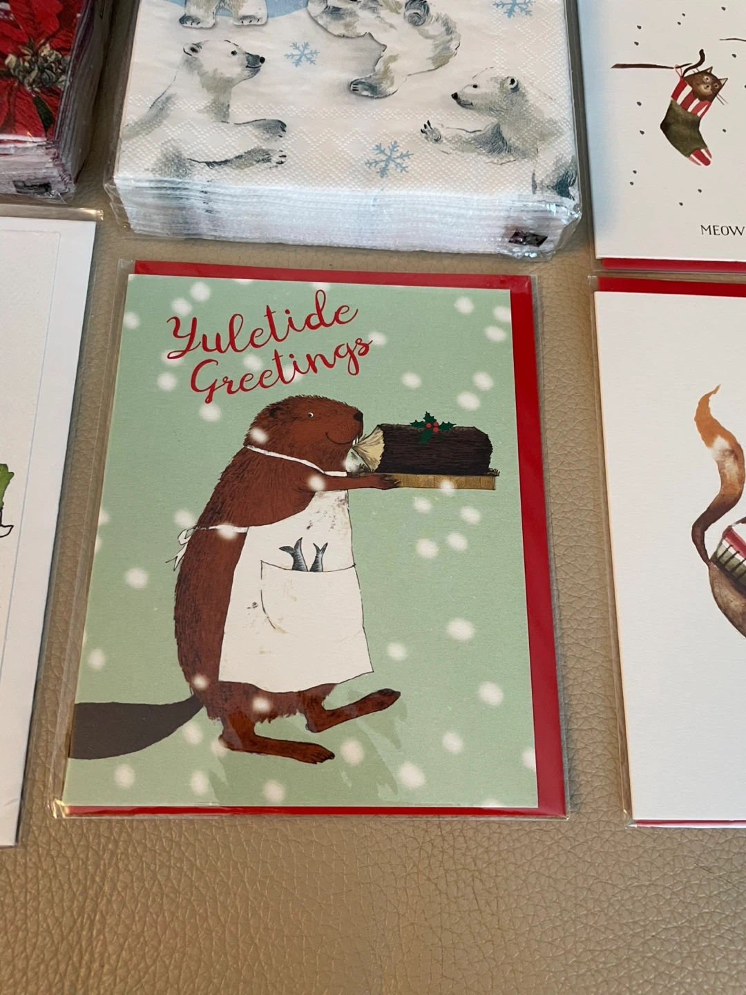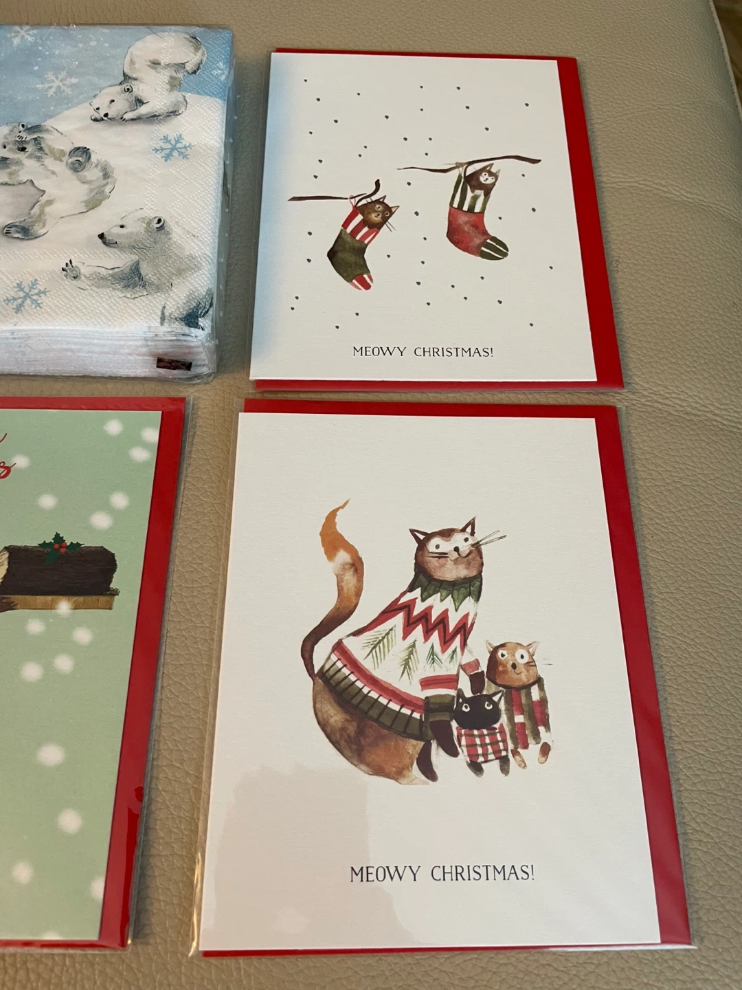 Selling 2 packs of NEW Christmas-themed napkins. And 5 NEW cards from IHR! The napkins come in a variety of festive designs, including polar bears and poinsettias. The cards feature adorable illustrations with holiday greetings like 'Meowy Christmas' and 'Yuletide Greetings'. Perfect for adding a touch of holiday cheer to your gatherings!