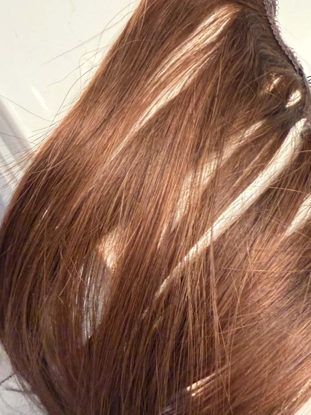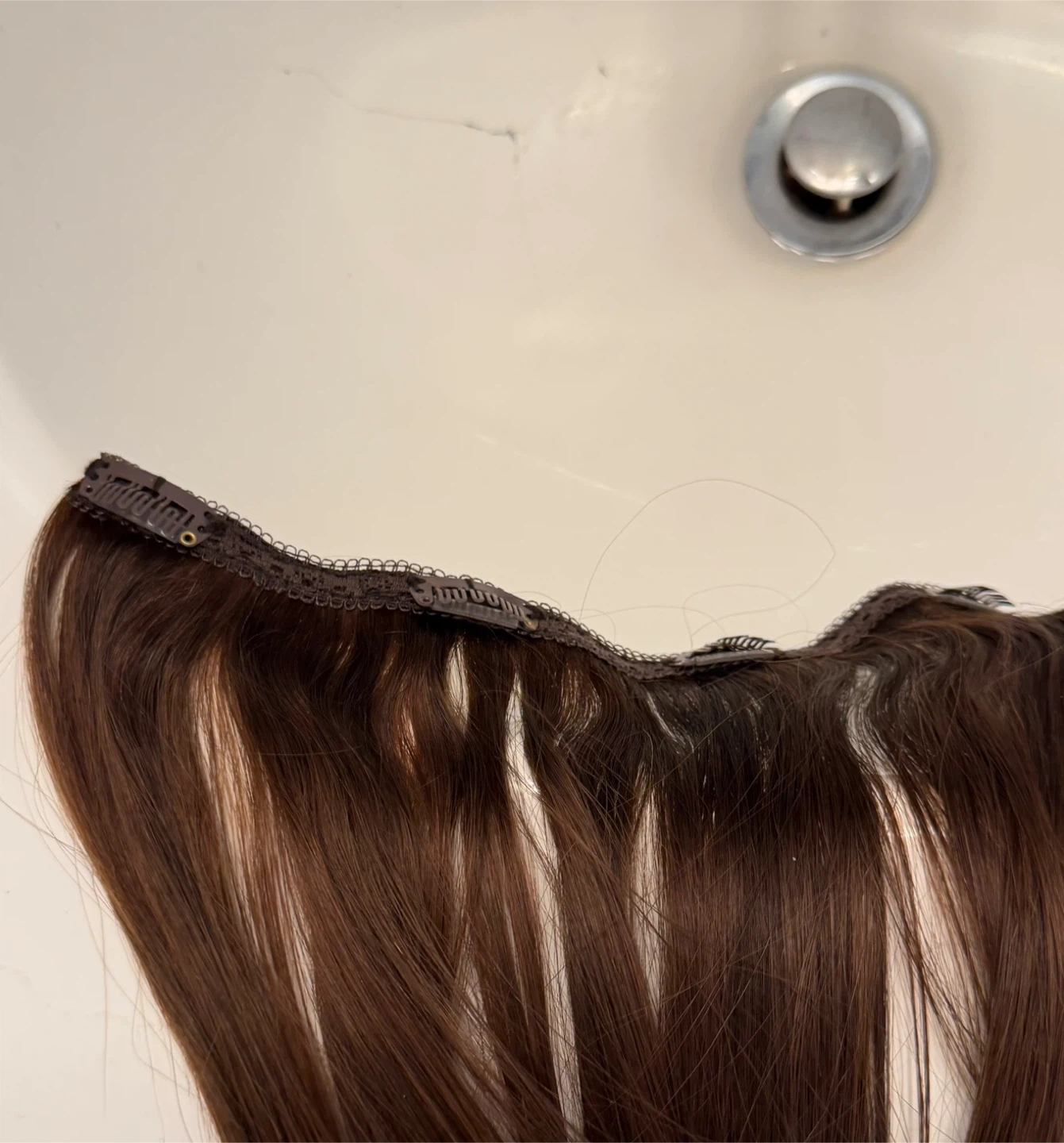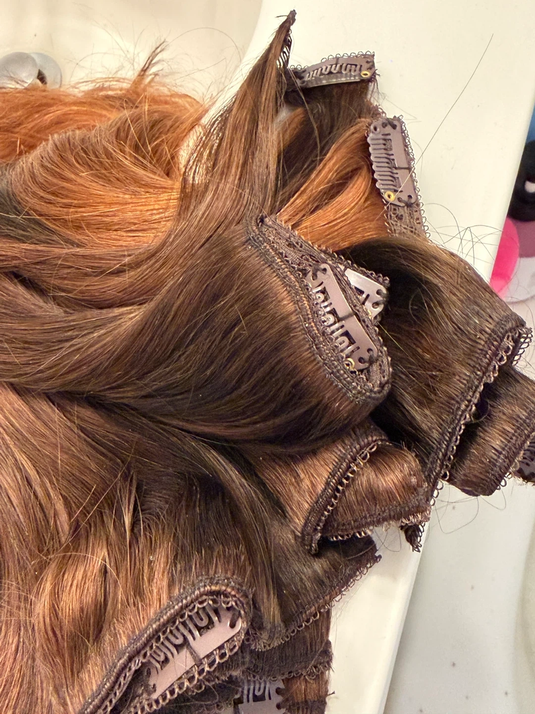 I'm selling brown clip in hair extensions. They're in used condition, but still have lots of life left! They are a mix of brown and auburn tones.
