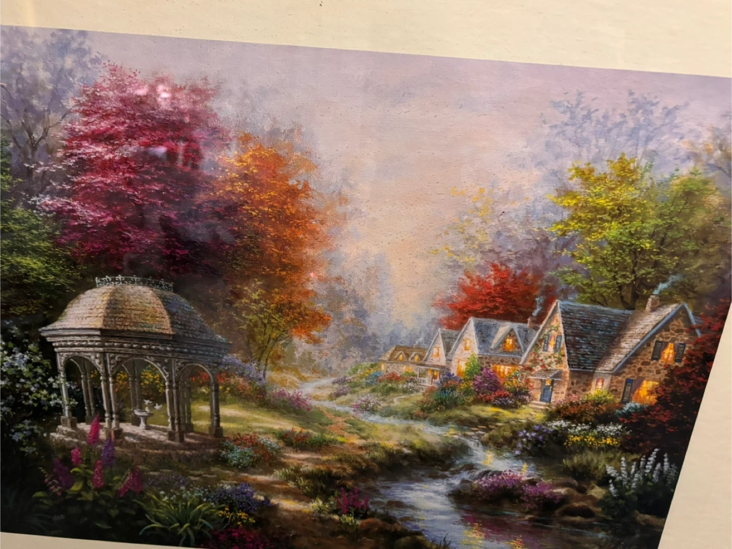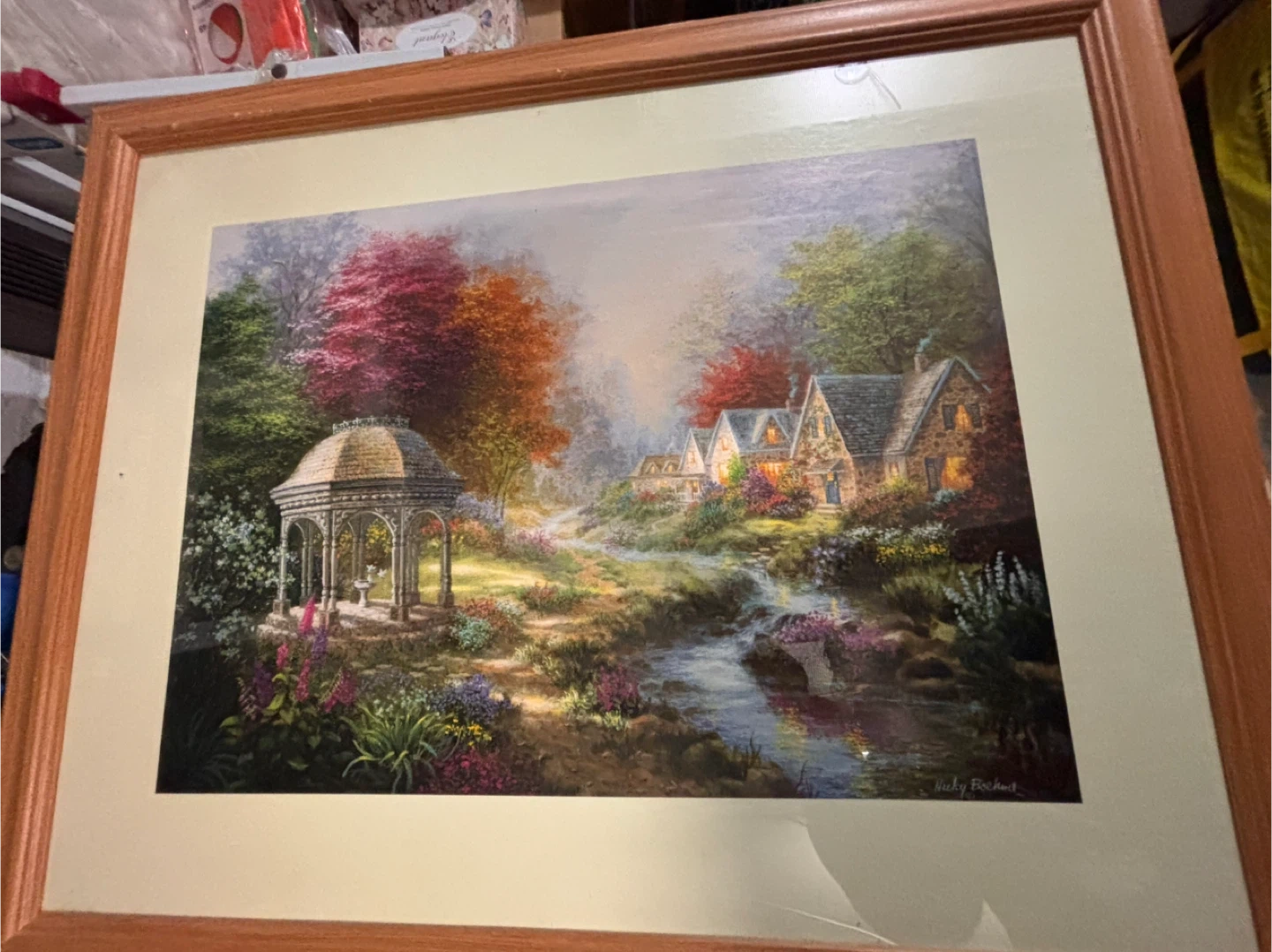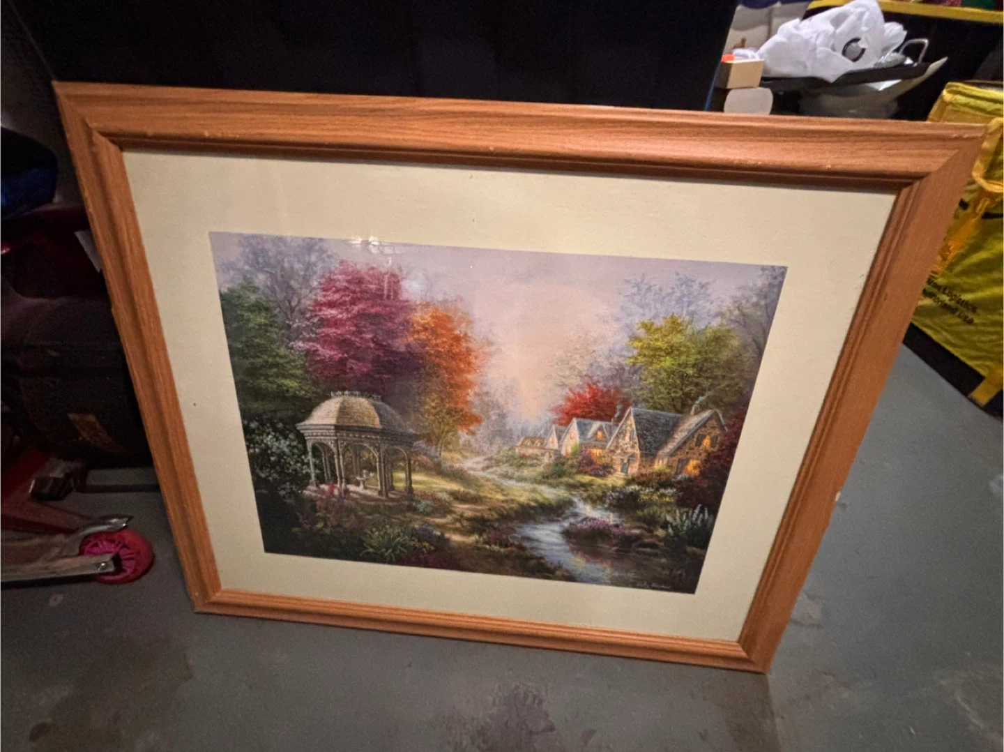 Selling a framed landscape art piece. It features a colorful scene with trees, a gazebo, and houses by a stream. The frame is a light brown color. It will add a nice touch to any room
