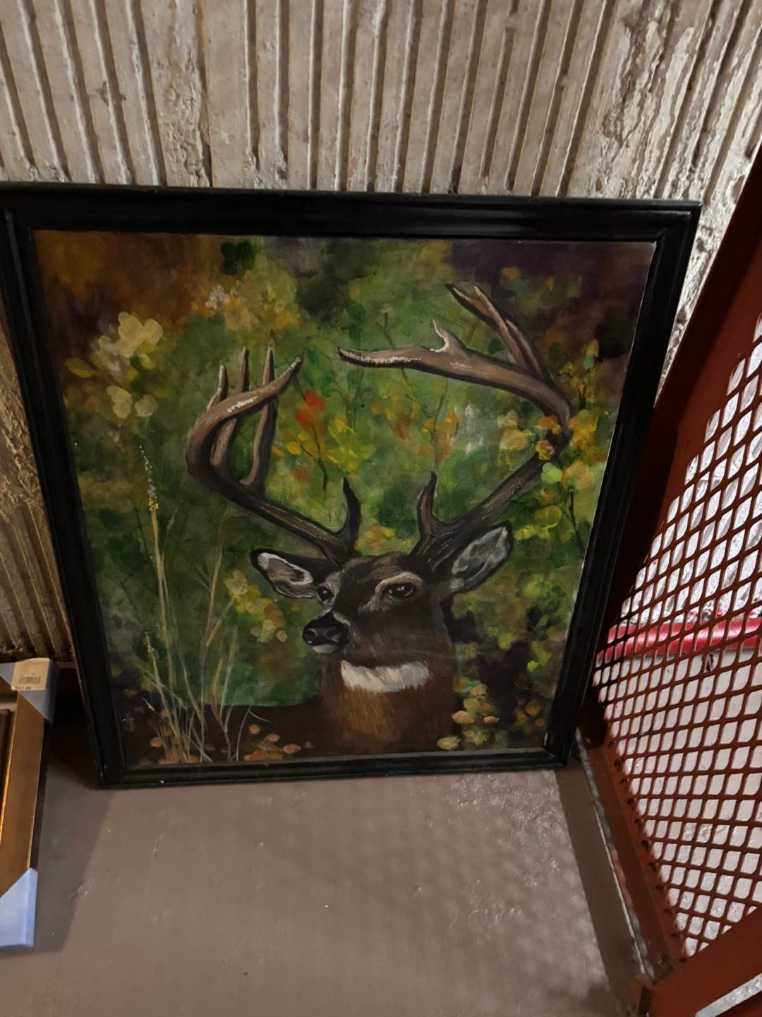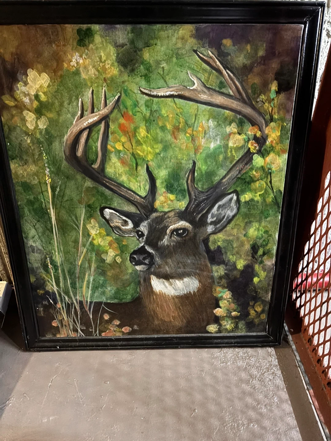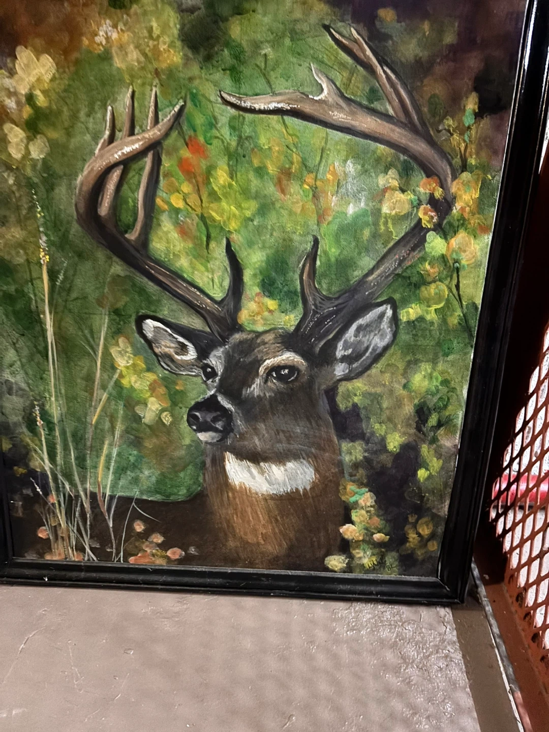 Selling a framed landscape art piece. It features a colorful scene with trees, a gazebo, and houses by a stream. The frame is a light brown color. It will add a nice touch to any room