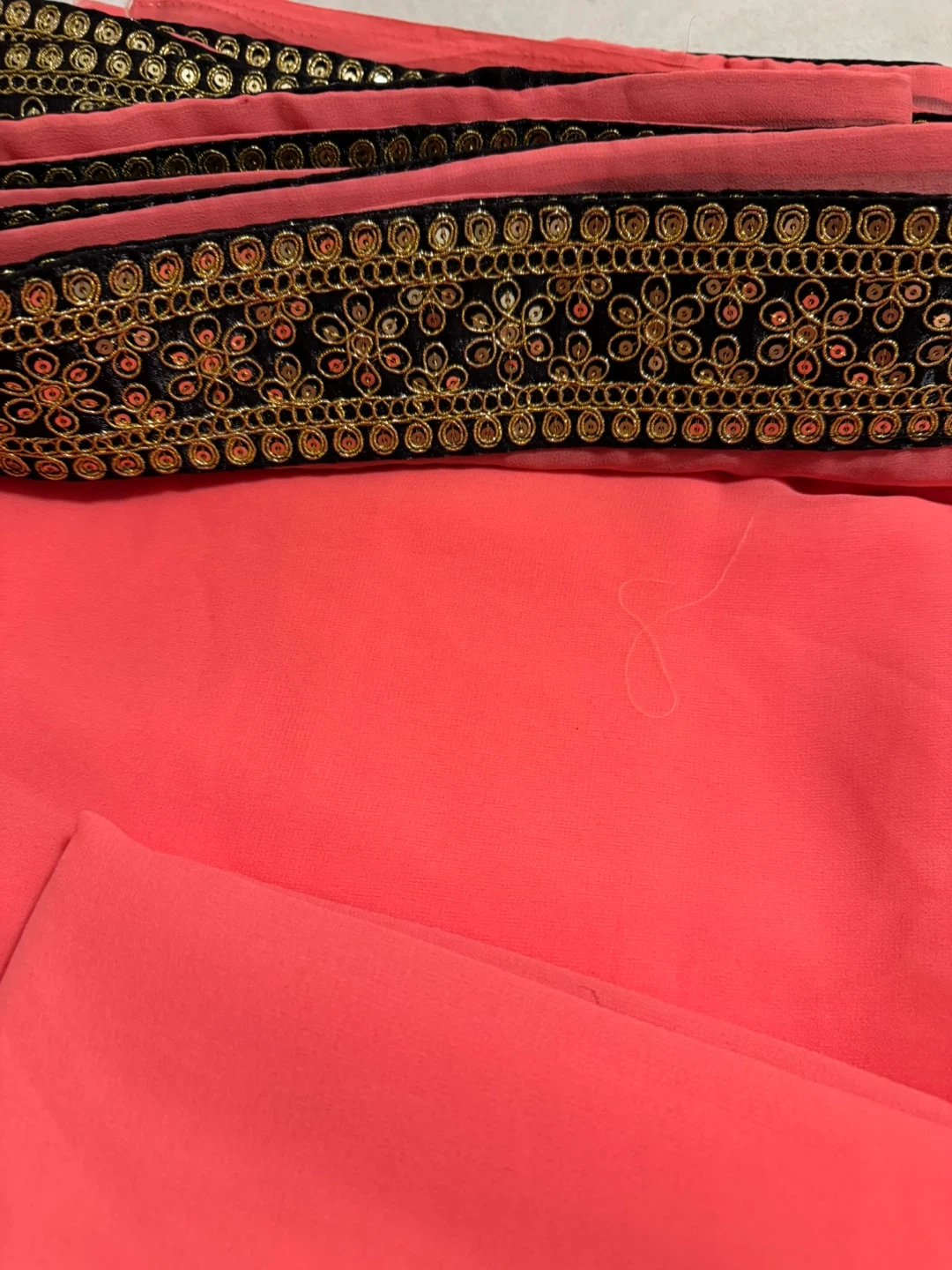 Brand new Beautiful pink saree with a detailed gold and black border. It's in great condition and ready for a new occasion!