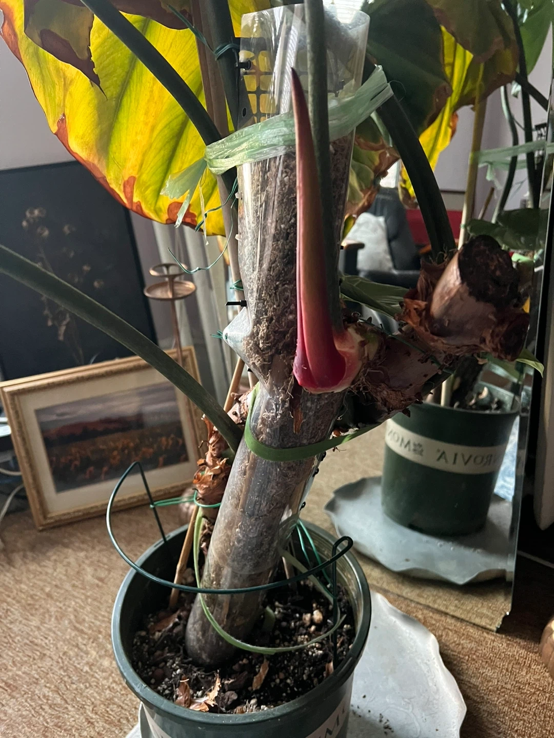 Selling a healthy philodendron plant in a pot. It has large, vibrant green leaves and is supported by a stake. Perfect for adding a touch of greenery to your home!