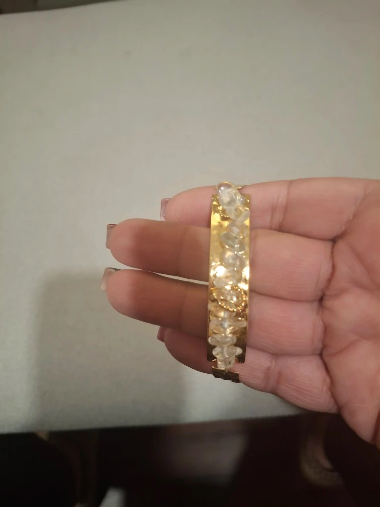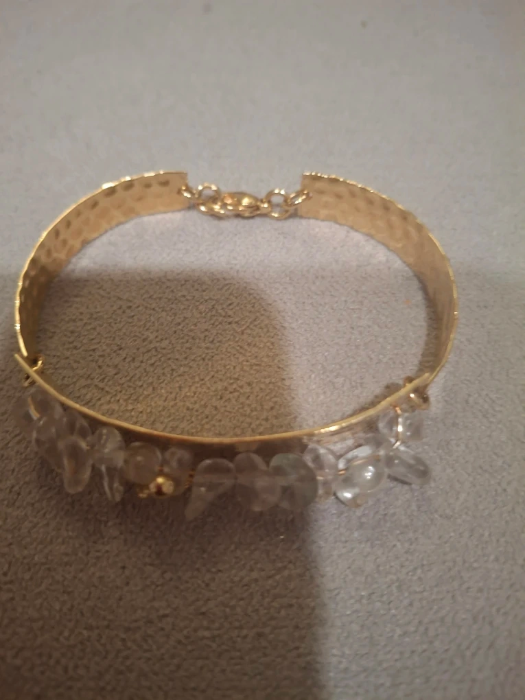 Selling a beautiful gold-tone bracelet adorned with clear stones. It's in great condition and would make a lovely addition to any jewelry collection! The bracelet has a delicate design with the clear stones adding a touch of sparkle.