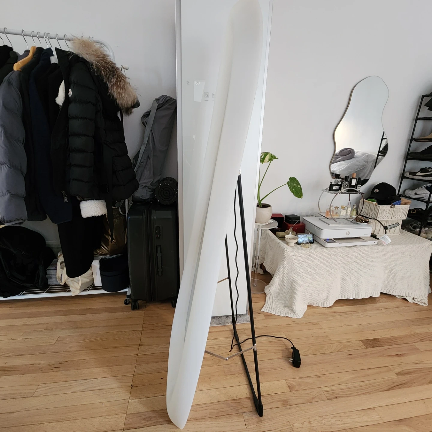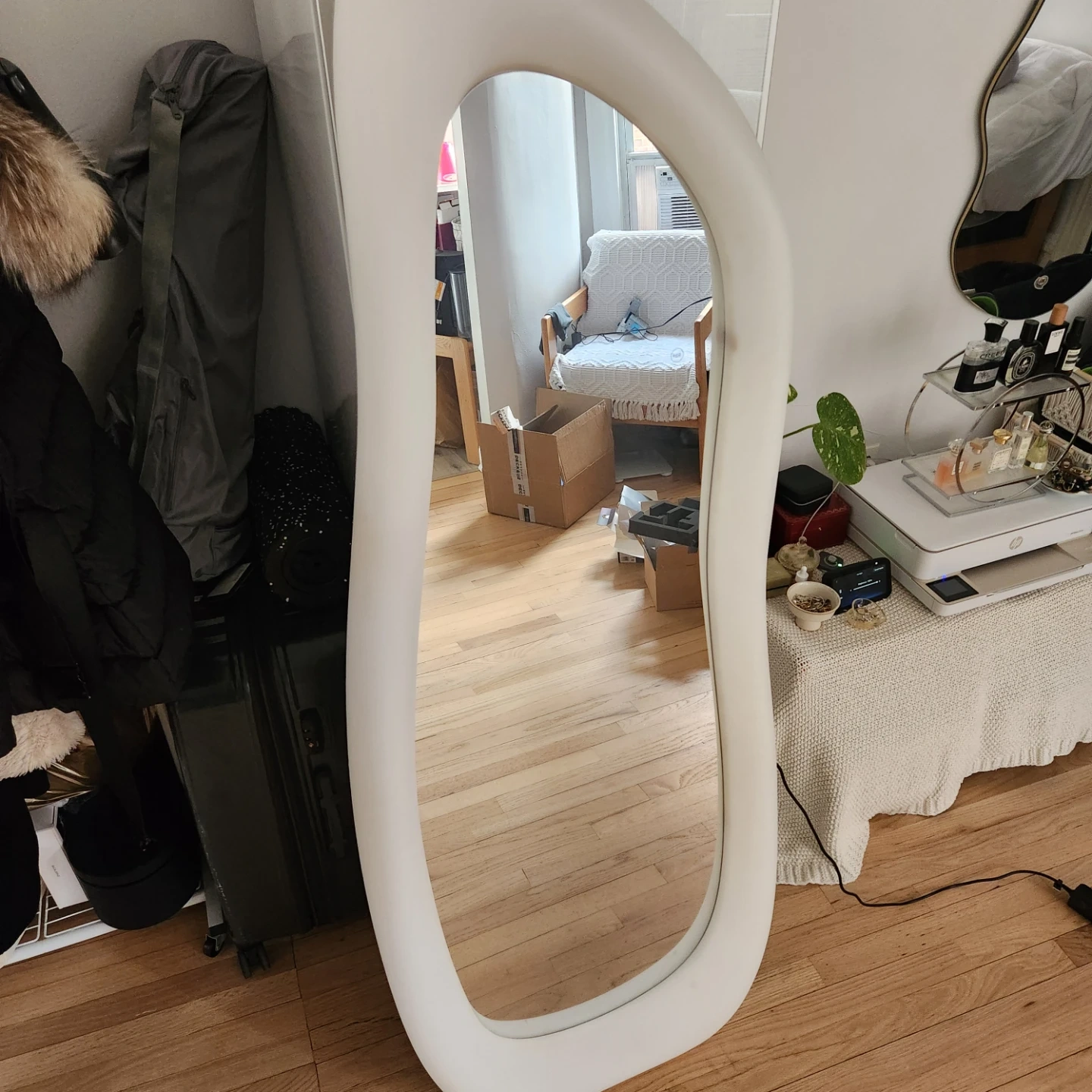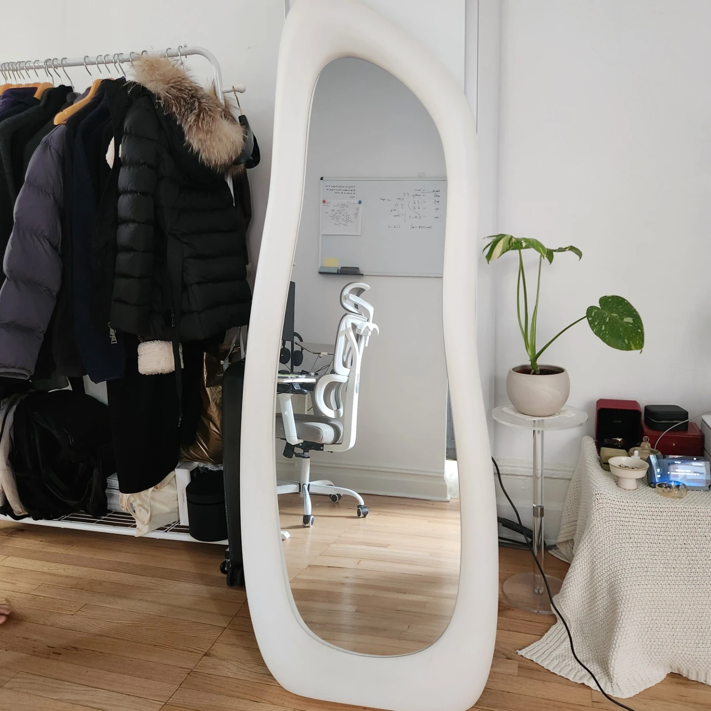 Selling a full-length mirror with a unique wave design! It's in great condition and would look great in any room. The mirror has a white frame and is ready to be picked up!