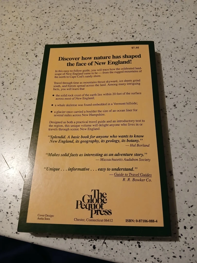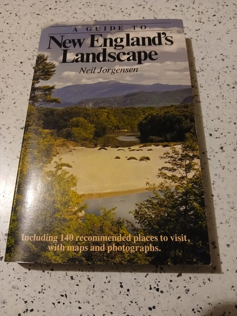 I'm selling a copy of "A Guide to New England's Landscape" by Neil Jorgensen. It includes 140 recommended places to visit with maps and photographs. This book will show you how nature has shaped the face of New England. Discover the solid rock crust of the earth that lies within 20 feet of the surface across most of New England