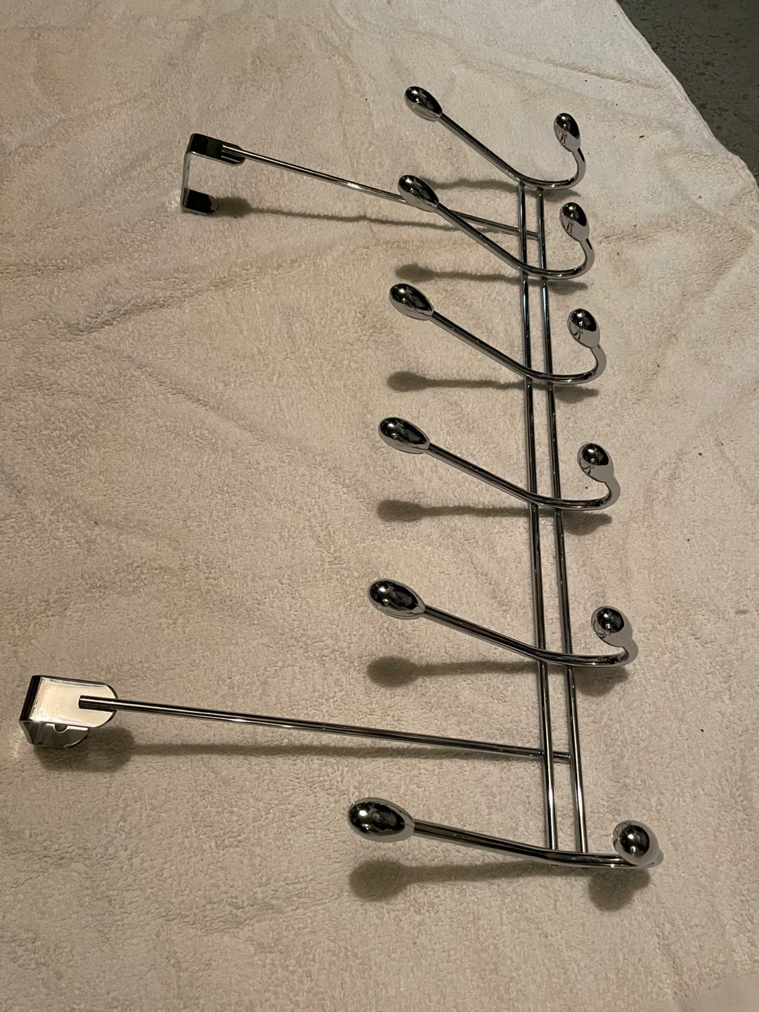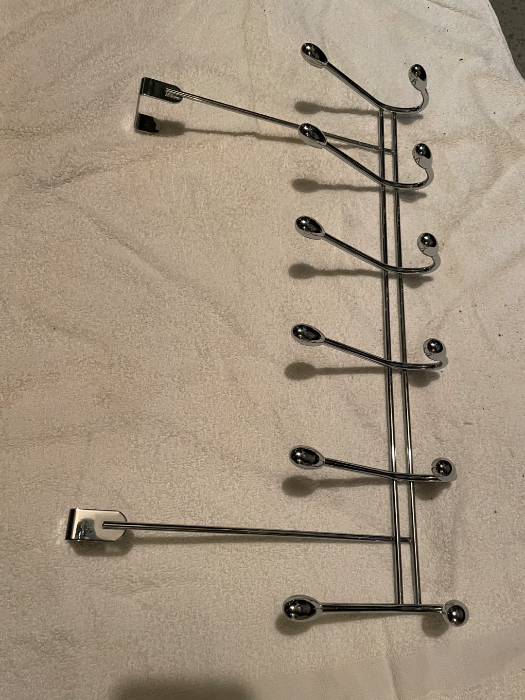 This is a chrome over-the-door hook rack, perfect for adding extra hanging space in your closet or bathroom! It's in great condition and ready to use right away