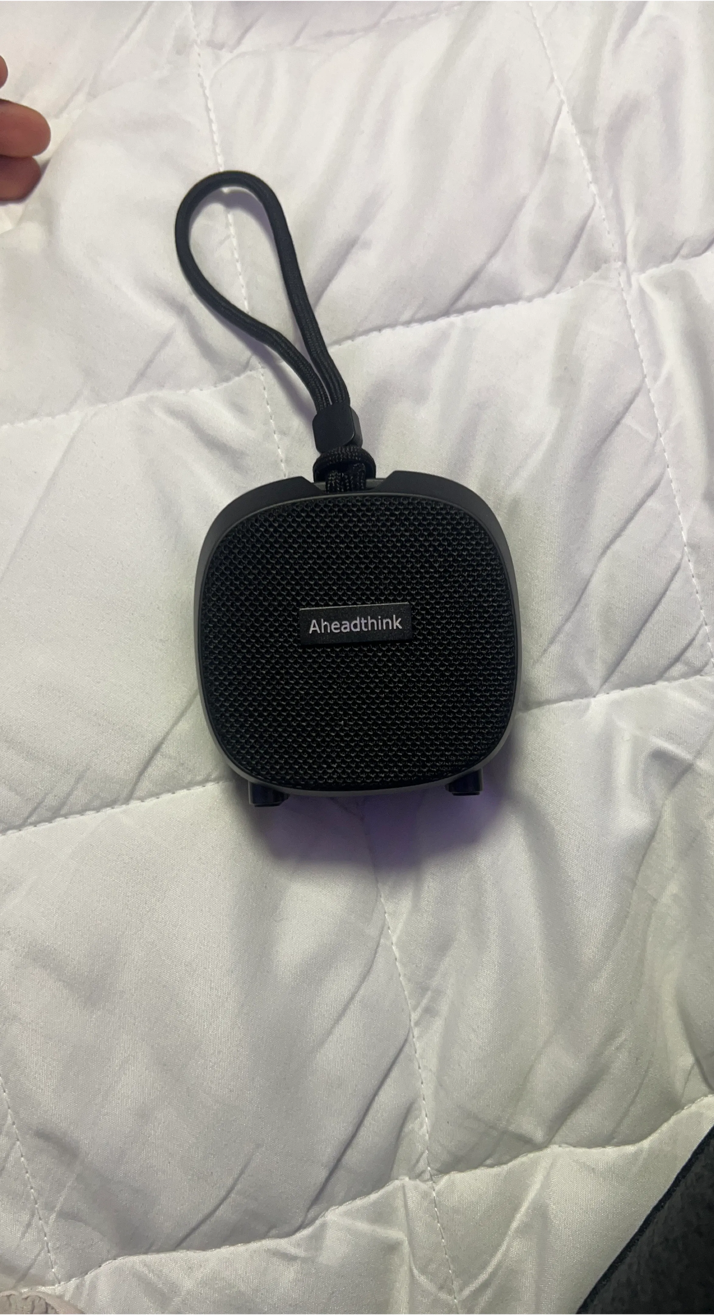 This is a compact, black portable speaker by Aheadthink. It features a built-in strap for easy carrying. It's great for listening to music on the go!