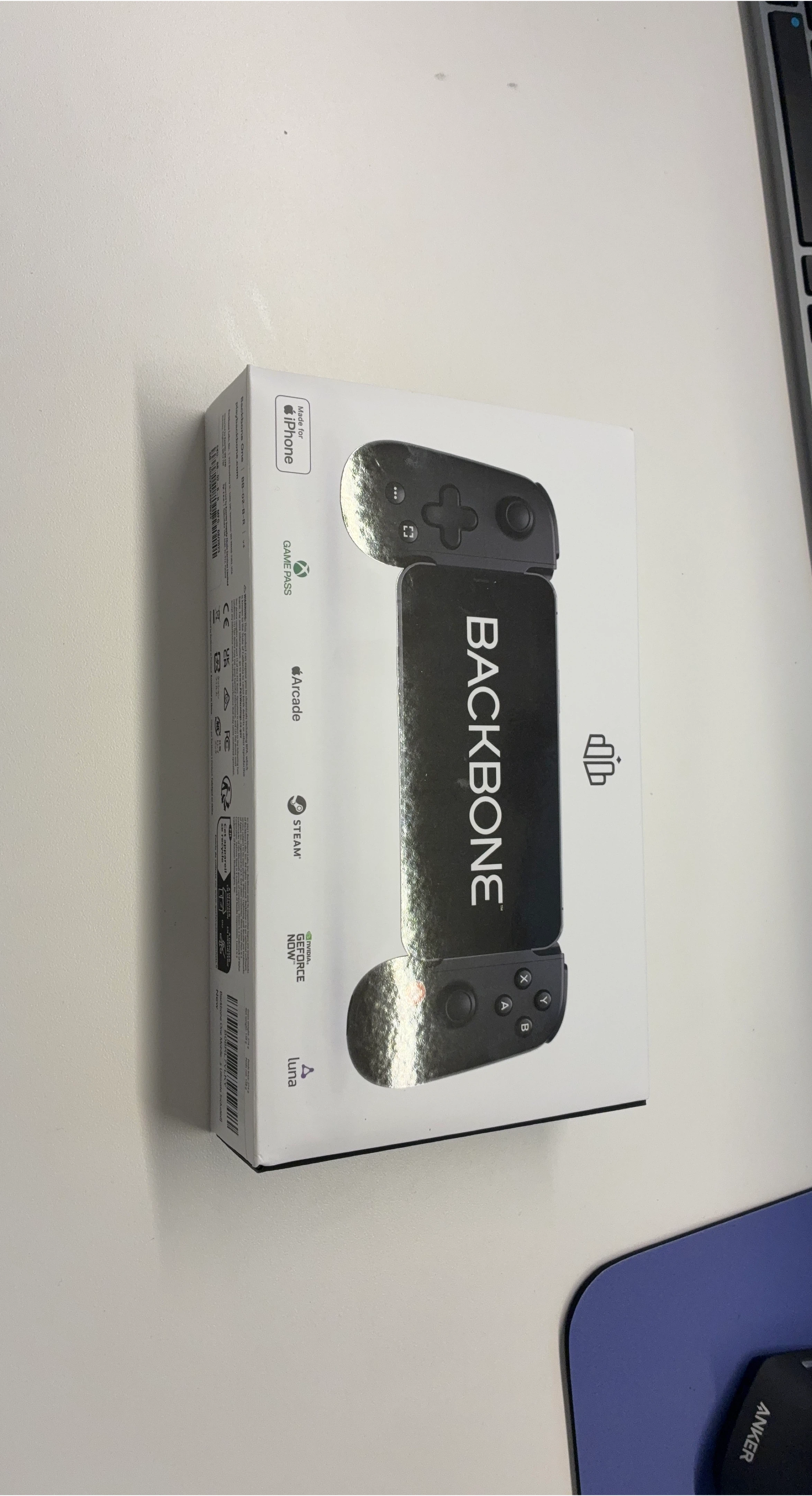 Selling a Backbone One mobile gaming controller for iPhone. It's compatible with the iPhone and supports platforms like Arcade, Steam, Xbox Game Pass, NVIDIA GeForce Now, and Luna. It comes with the original box