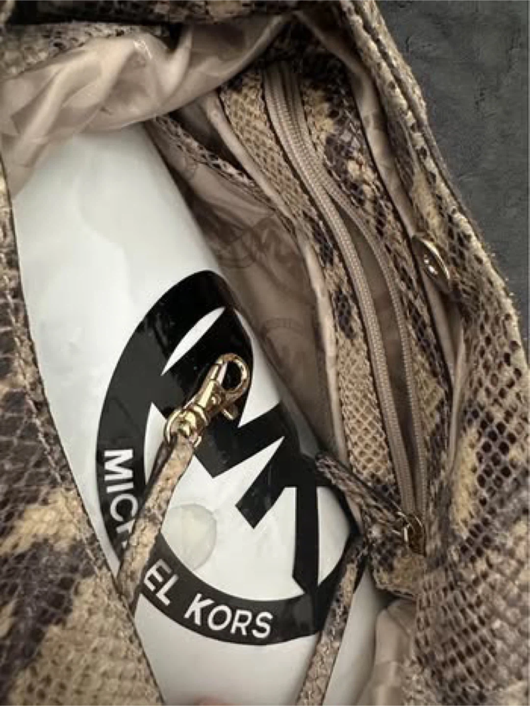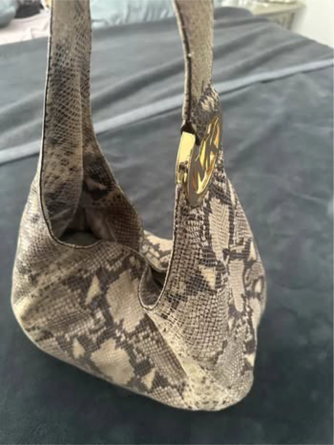 Ladies' Authentic Michael Kors "Python" snakeskin hobo shoulder bag with gold logo in metal/hardware. Five internal pockets, one of which has a zipper and a magnetic button closure. Original Dust Bag included!! Truly a gorgeous purse!