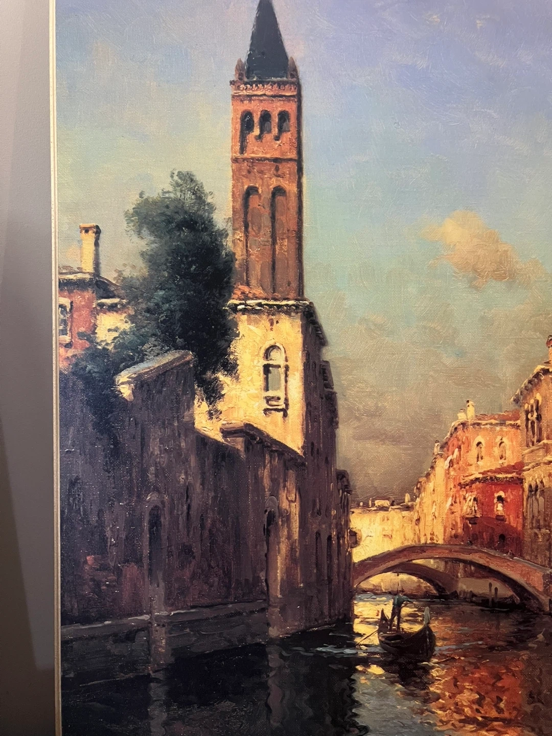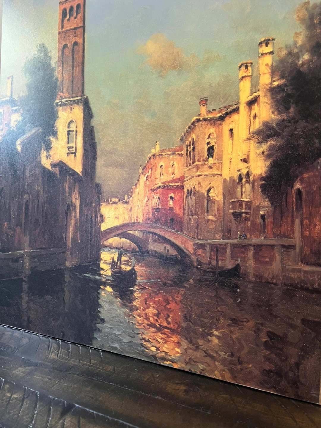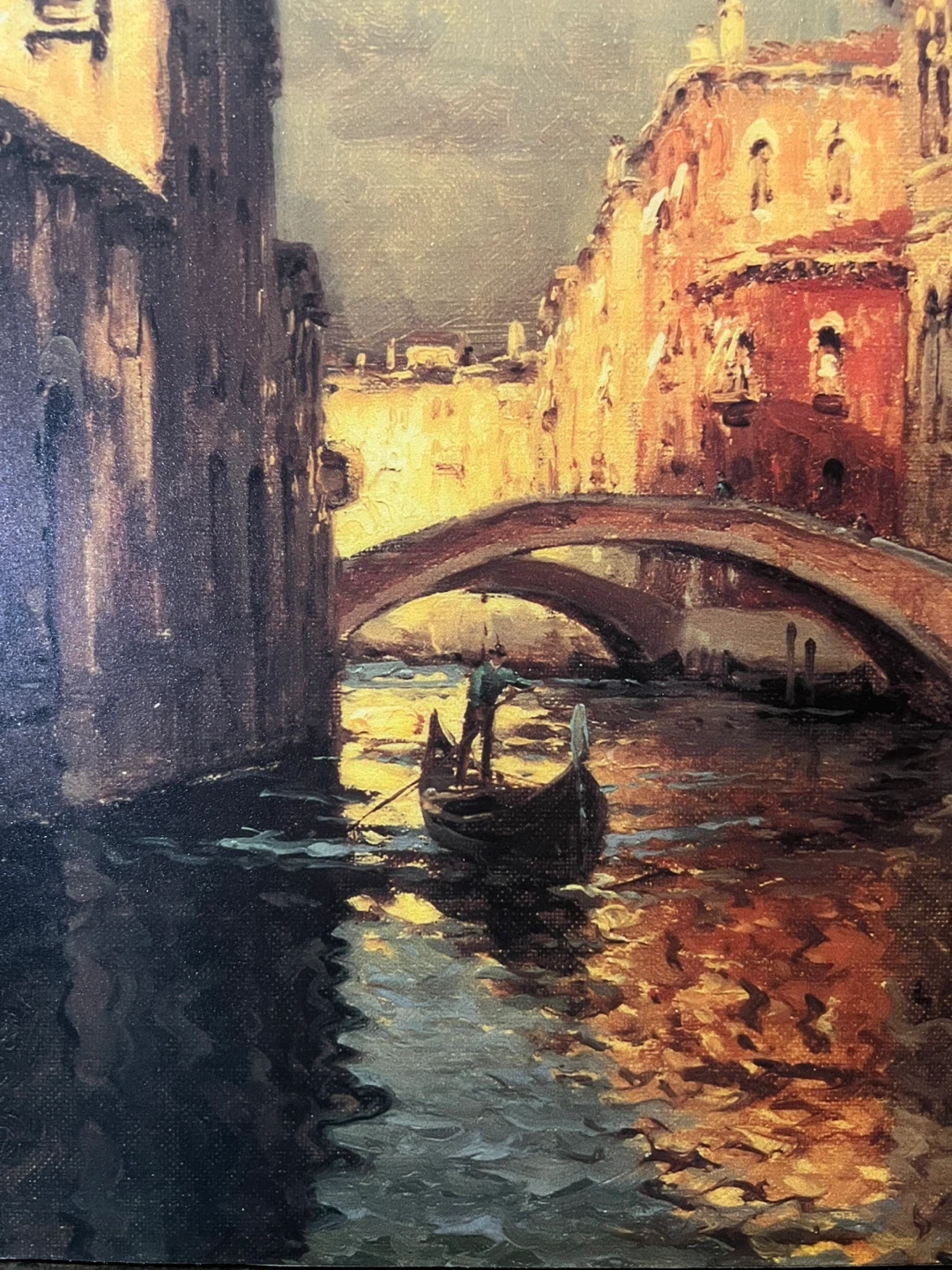 Venice canal scene capturing gondola surrendered by historic buildings and a bridge in a distance
