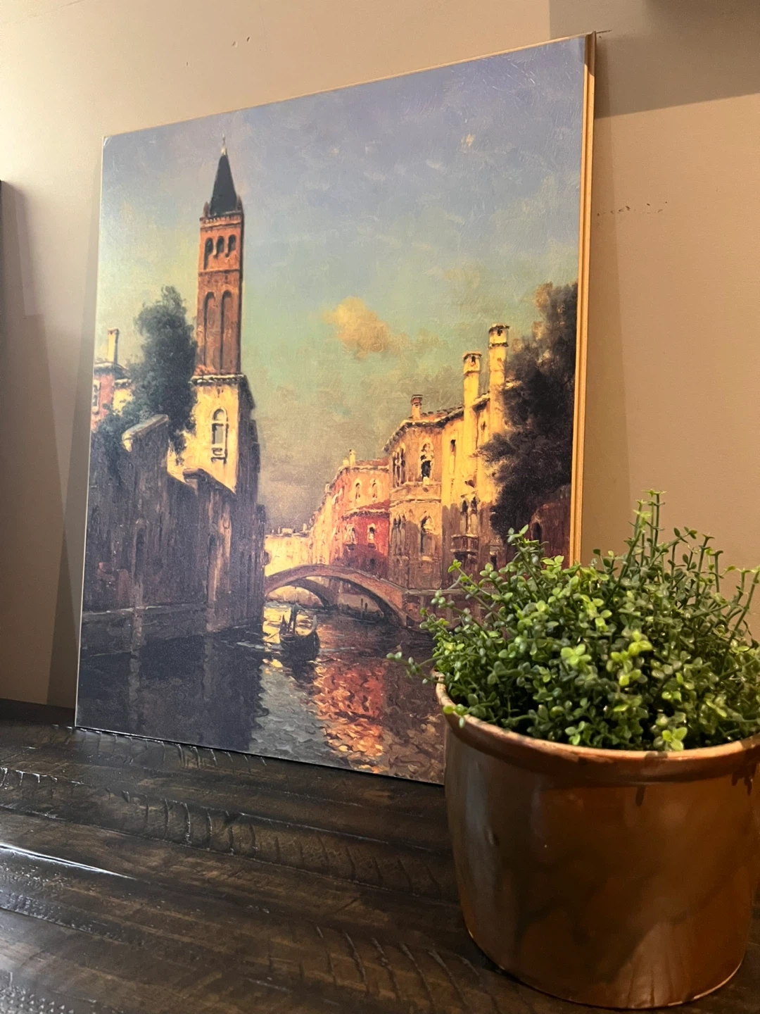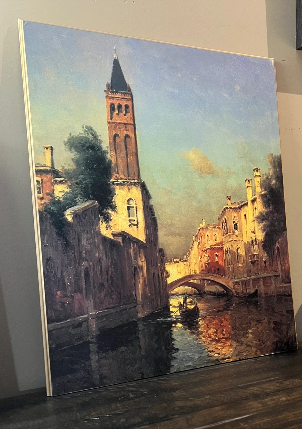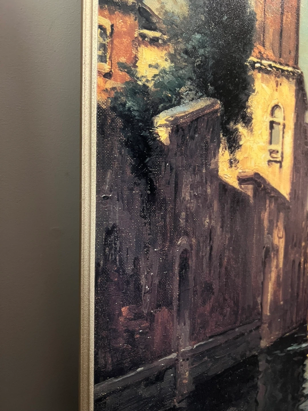 Venice canal scene capturing gondola surrendered by historic buildings and a bridge in a distance
