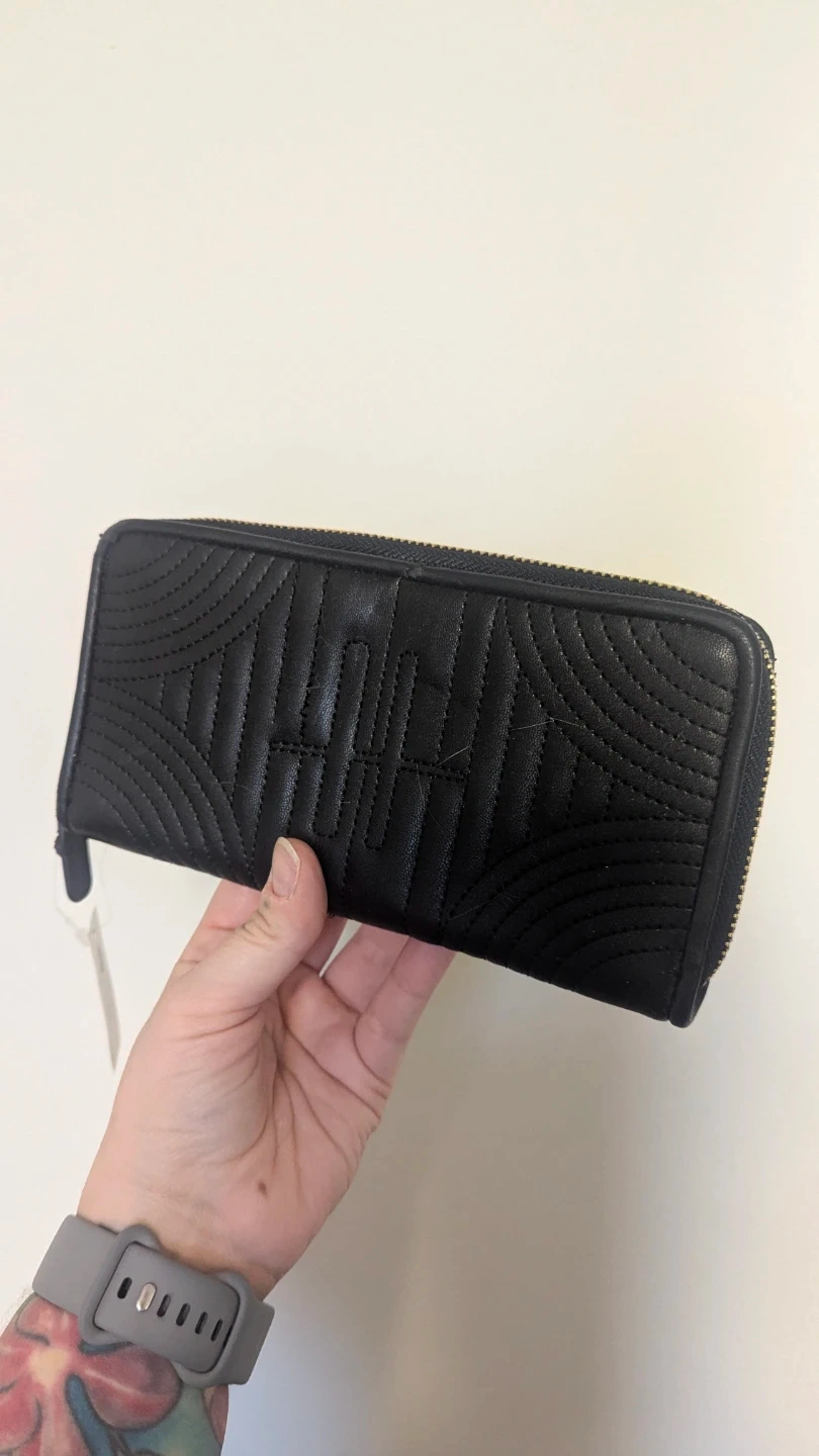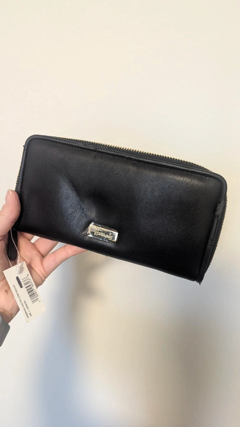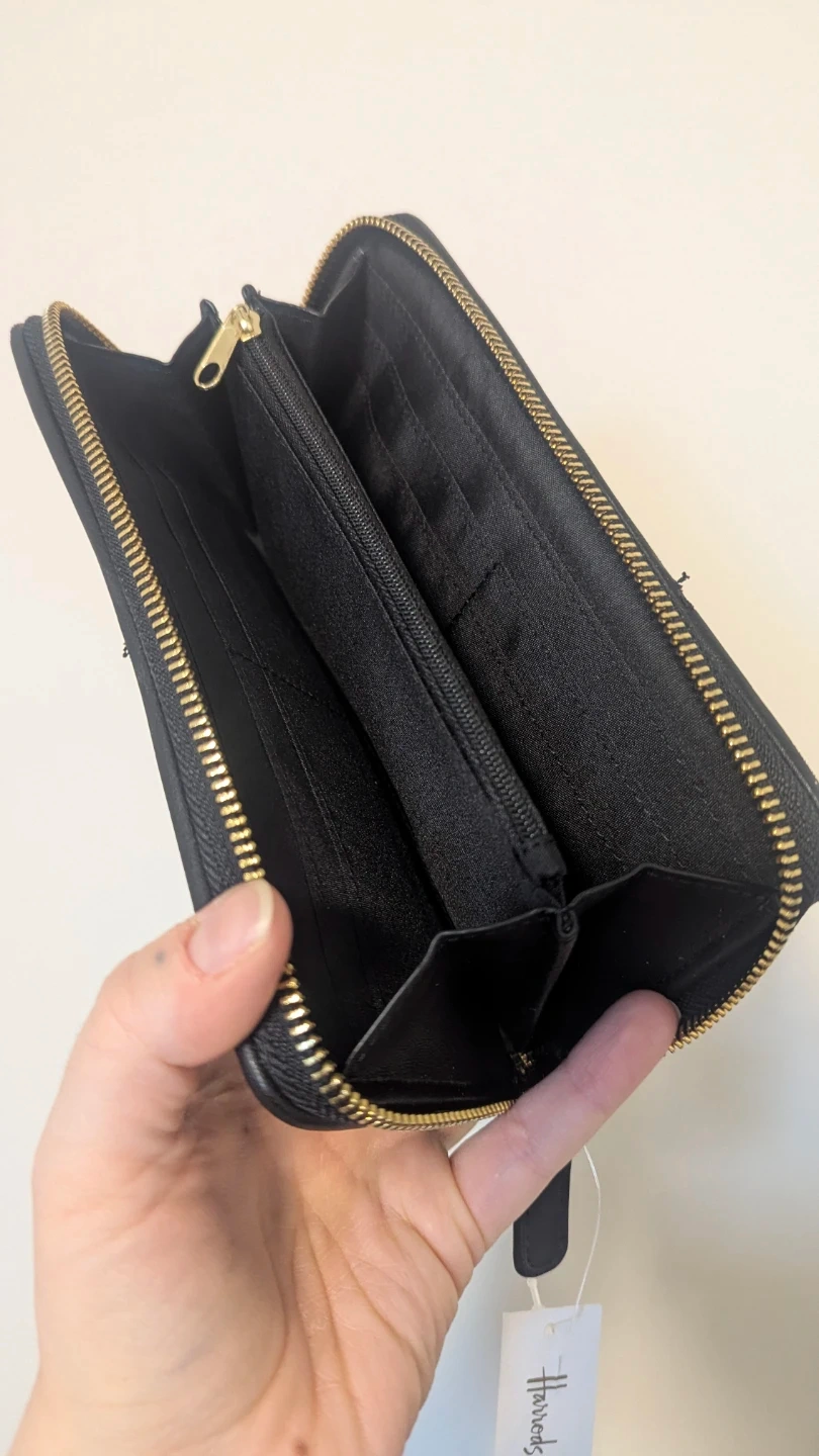 This is a Harrods black leather zip-around wallet. It has a sleek design with gold-tone hardware. Perfect for keeping your essentials organized!