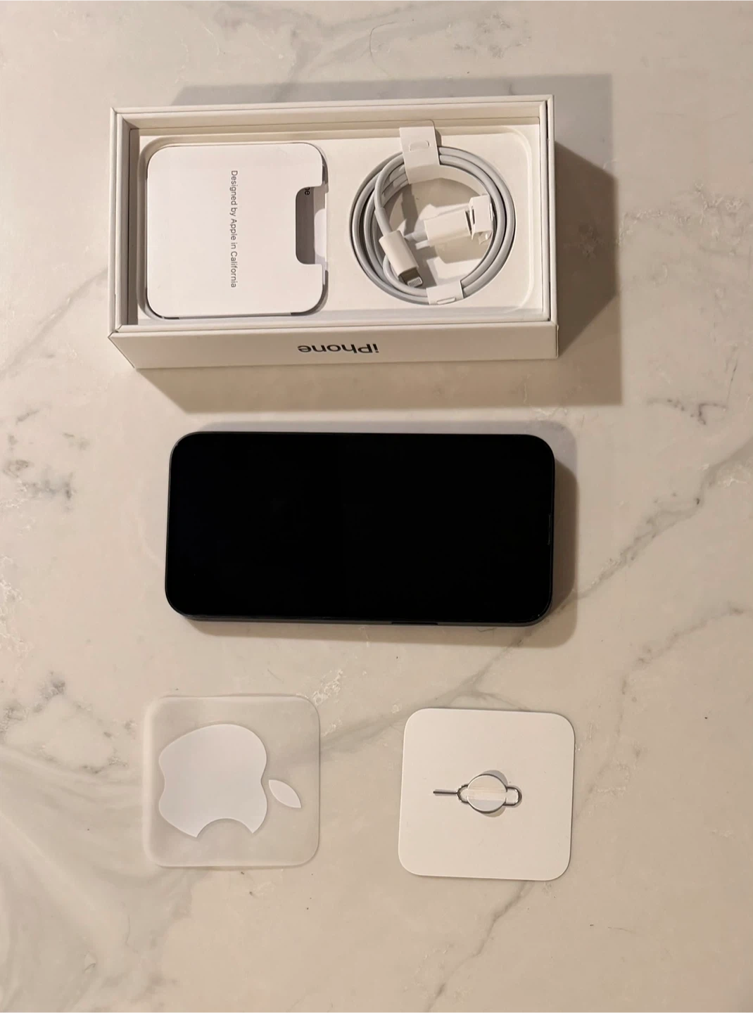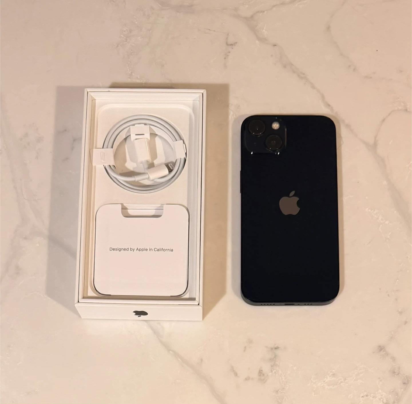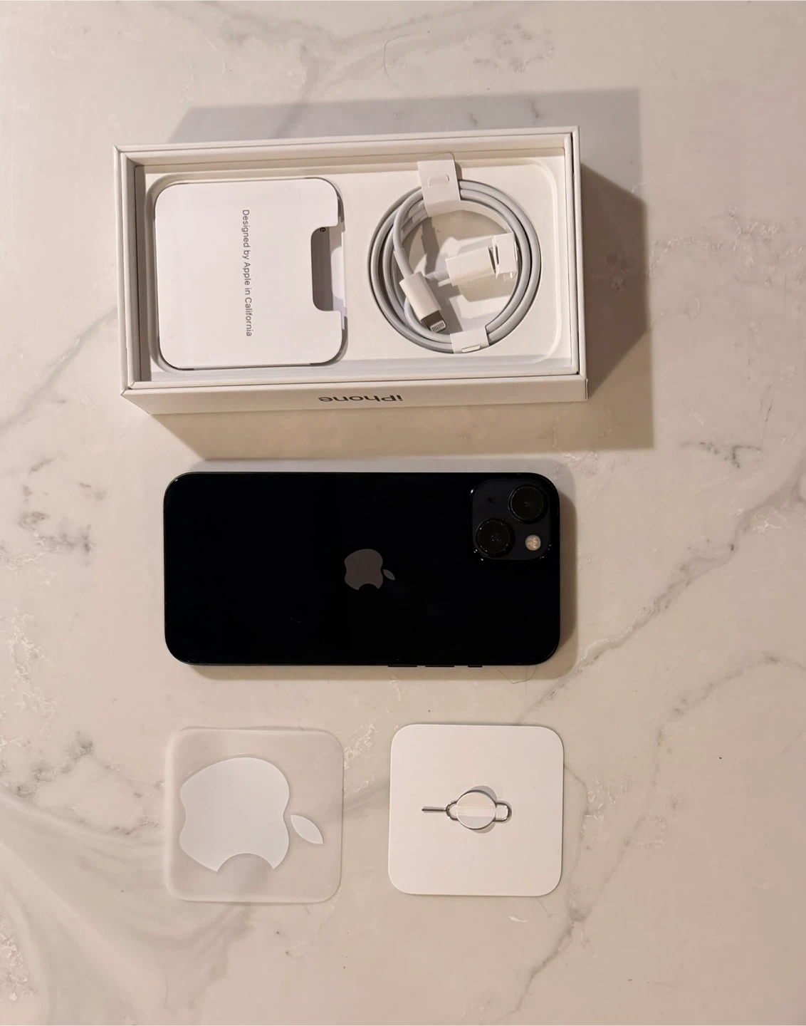 Selling mint condition Unlocked iPhone 13 in Midnight Black 128GB! It comes with its original box and all included components like the charger and SIM ejector tool. It has been used for less than a year, has a battery health of 93%, and is still in perfectly good condition!