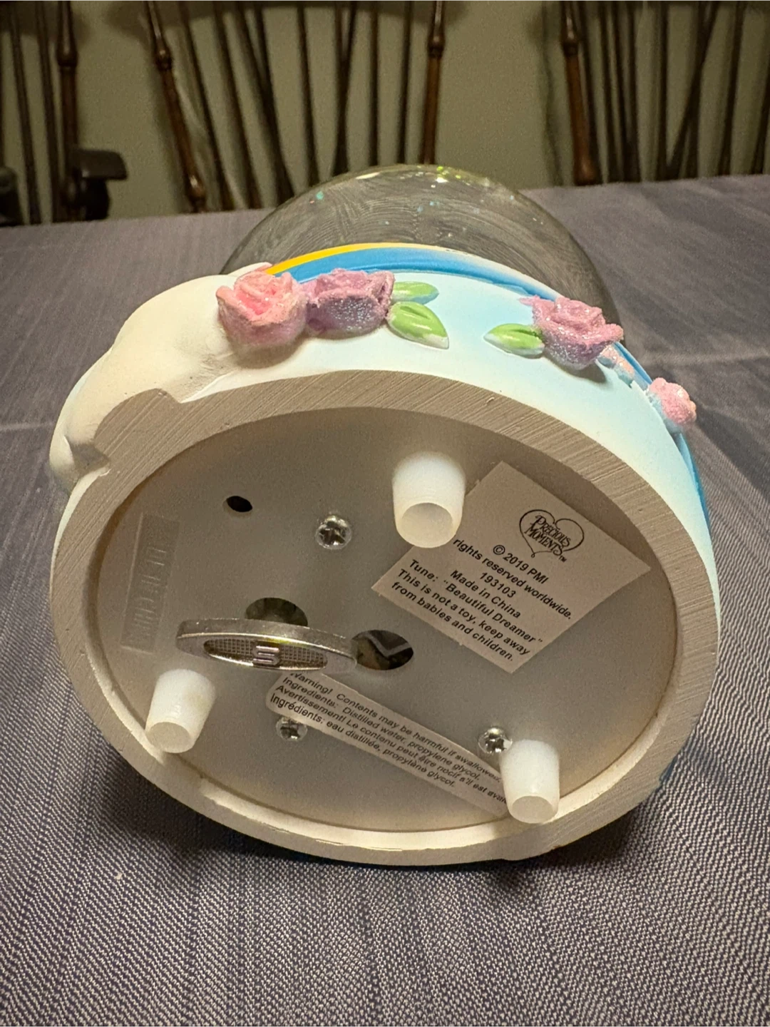 This is a Precious Moments snow globe featuring a unicorn inside! The base has a rainbow and flowers, and the words "Believe in magic and yourself!" are written on it. It also plays the tune "Beautiful Dreamer"