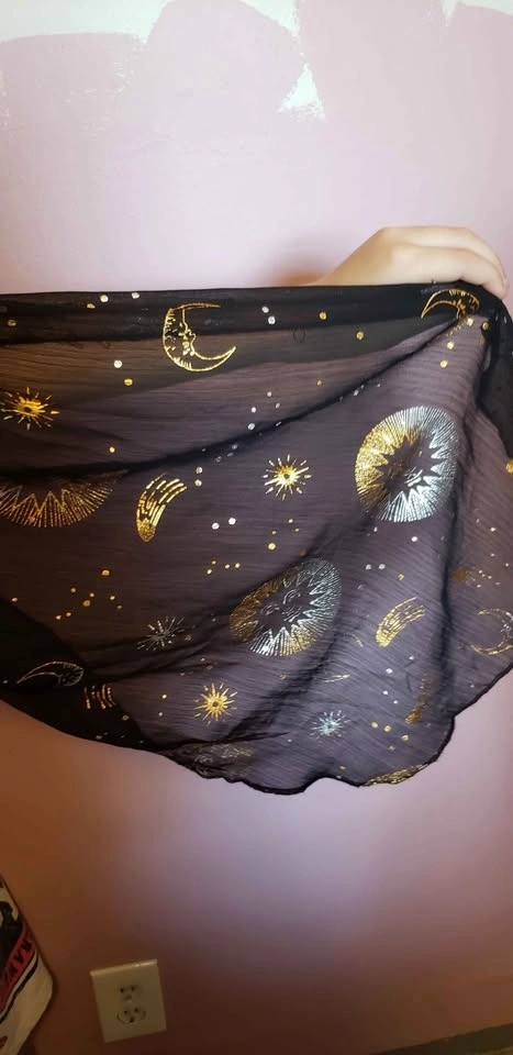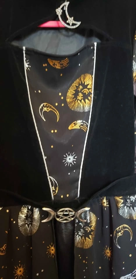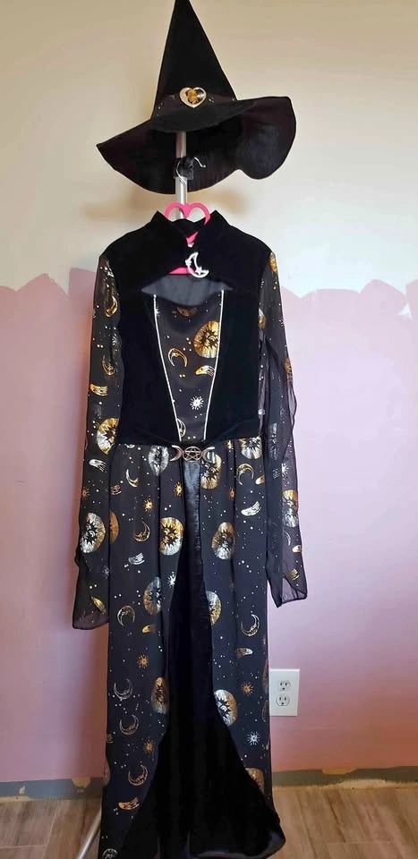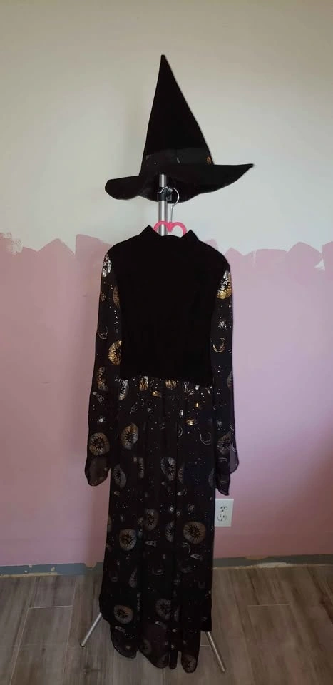 We are selling a Stars and Moon Witch costume, girls size xl. Comes with dress, hat, and broom. Worn twice and in great shape. Nicely detailed costume.
