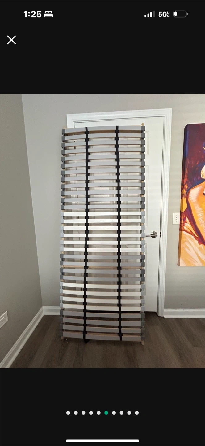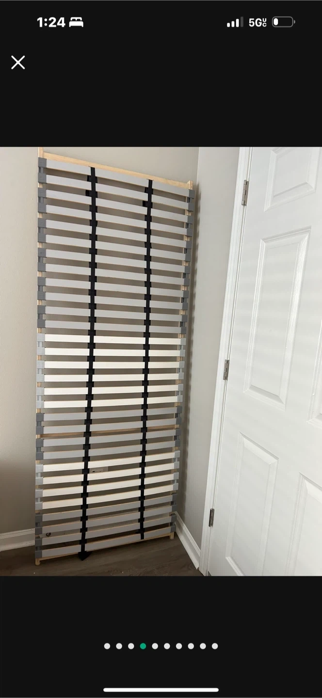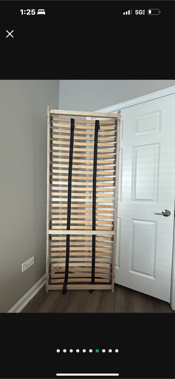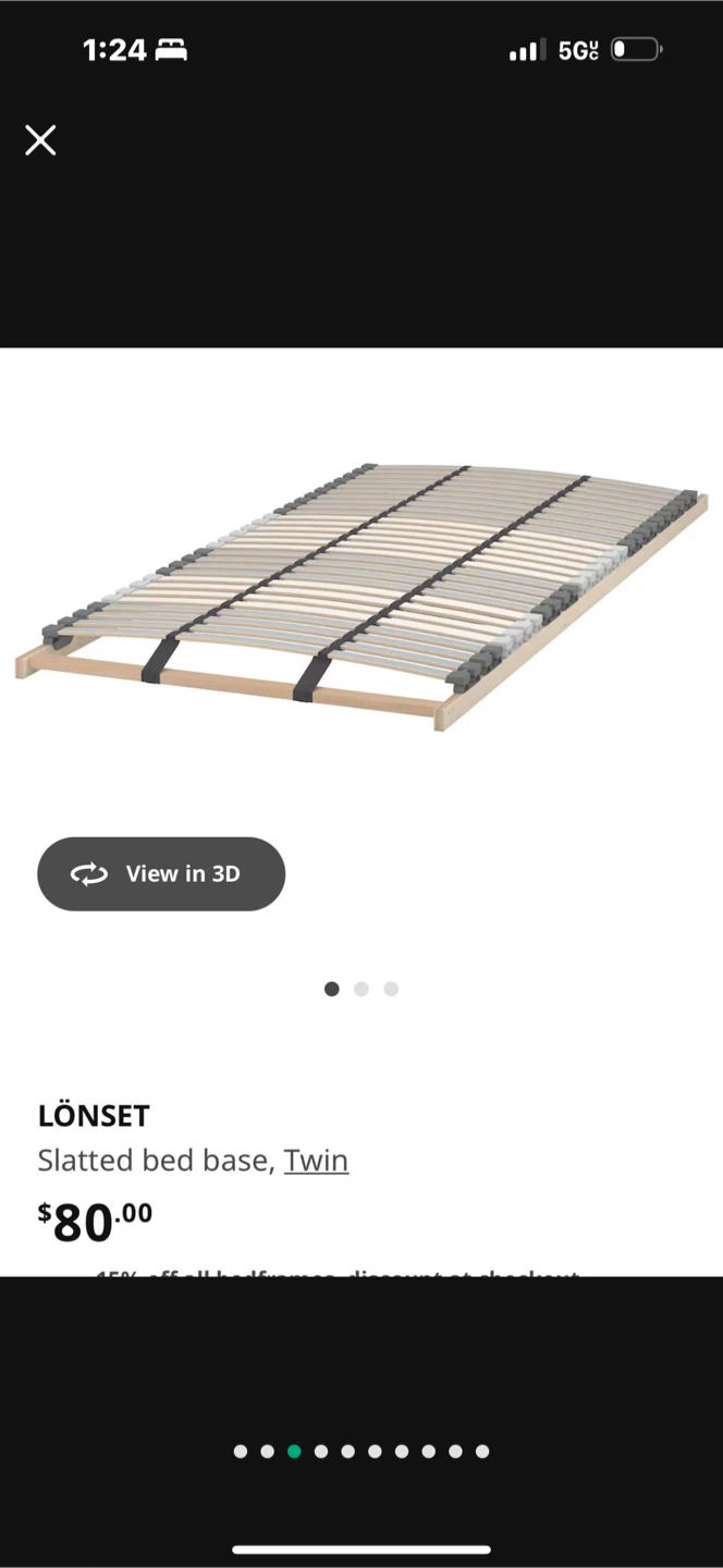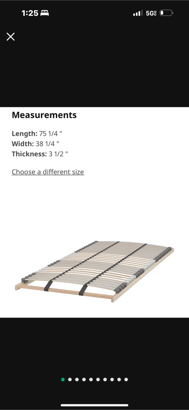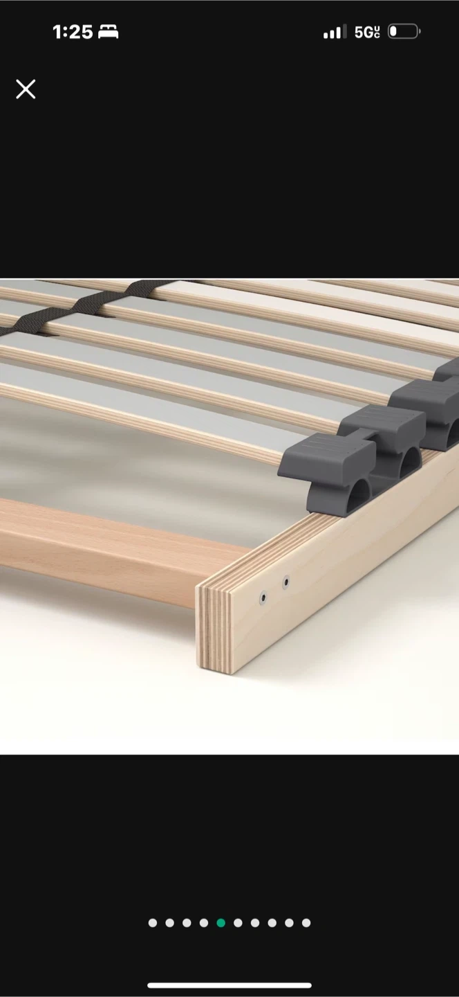 Selling an IKEA LÖNSET slatted bed base, perfect for a twin-sized bed! The curved slats adjust to your body weight and movements, creating a supple foundation for your mattress. Comfort zones are softer around the hips and shoulders to keep the spine aligned and offer support for the whole body. The open construction allows for air circulation, keeping your mattress fresh.