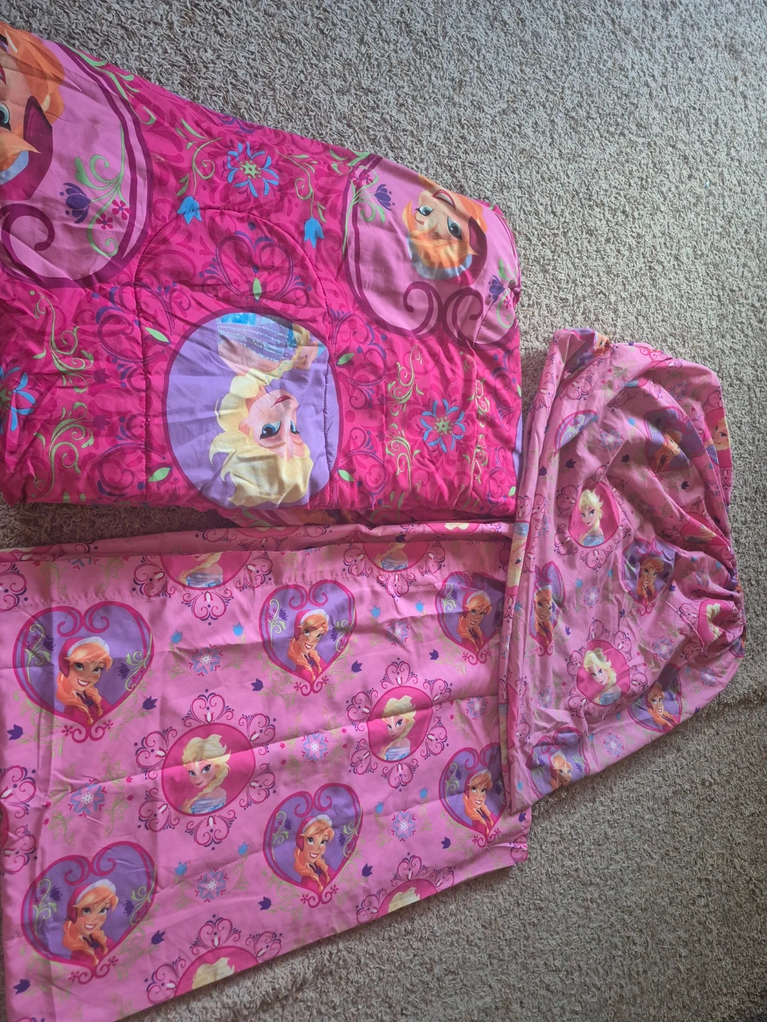 Get ready to transform your little one's bedroom with this adorable Disney Frozen twin bedding set! Featuring Elsa and Anna, this set is perfect for any Frozen fan. The set includes a comforter and fitted sheet, both in good condition and ready to bring some magic to bedtime