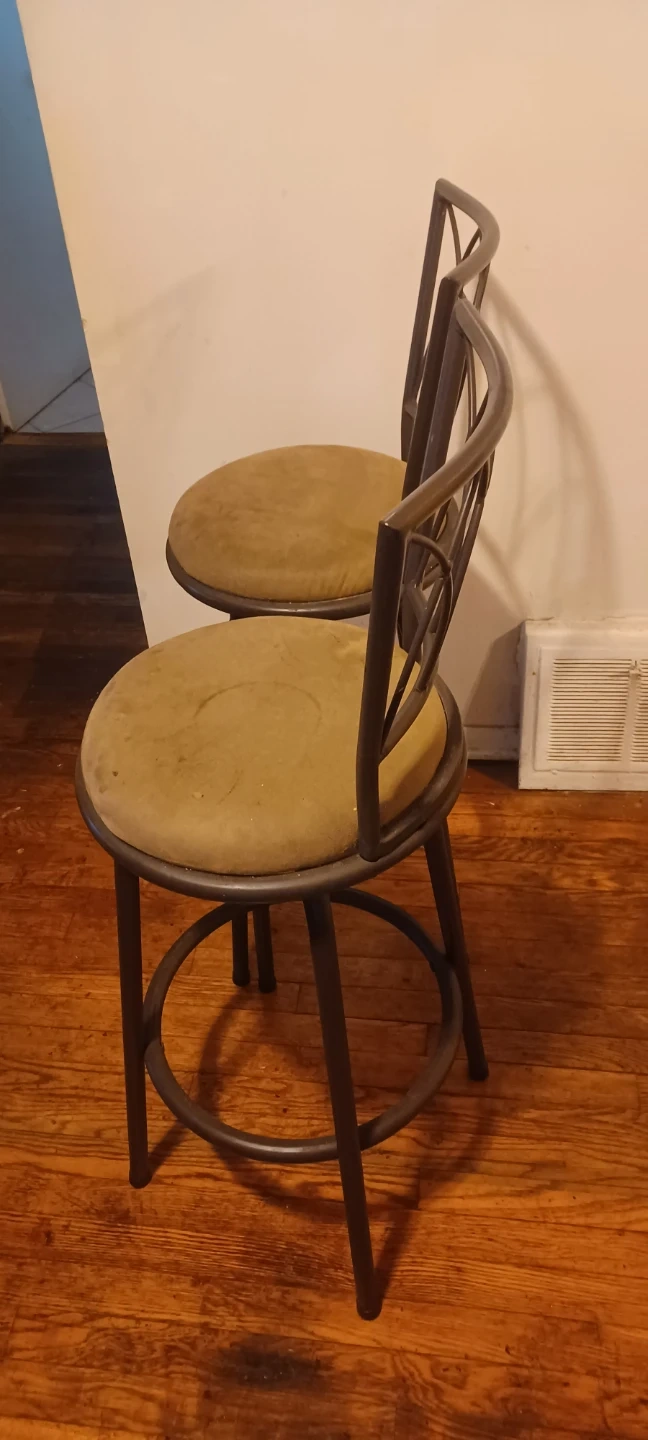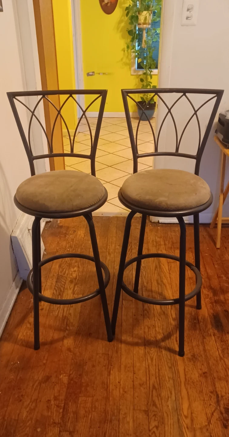 Selling a set of two bar stools. They feature a brown seat and a dark metal frame. These stools would be a great addition to your kitchen or bar area!