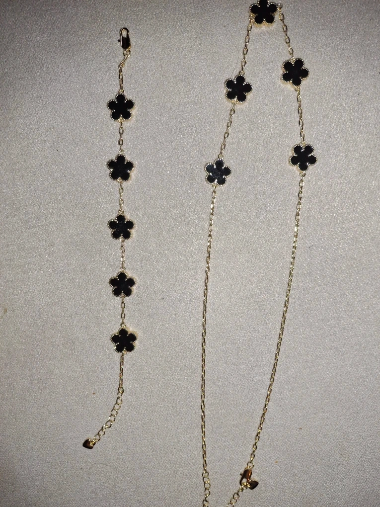 Selling a beautiful set, including a necklace and bracelet. The set features the iconic clover design with black inlays and a gold-tone chain. A timeless and elegant addition to any jewelry collection!