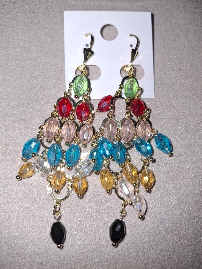 These colorful beaded dangle earrings are perfect for adding a pop of color to any outfit! They feature a variety of beads in green, red, pink, blue, yellow, and clear, with black accents at the bottom. These are in great condition and ready to wear!