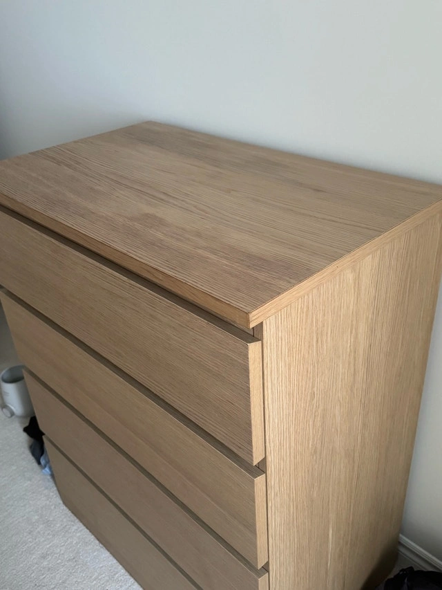 Beautiful and modern IKEA STORKLINTA dresser in a white oak / oak-effect finish. Features 4 smooth-gliding drawers with the anchor/unlock safety function. Super sturdy, great storage, and fits perfectly in any bedroom or nursery. Only minor chips as shown in the photos — otherwise in great condition! Dimensions: 70x48x98 cm (27 1/2 x 18 7/8 x 38 5/8")