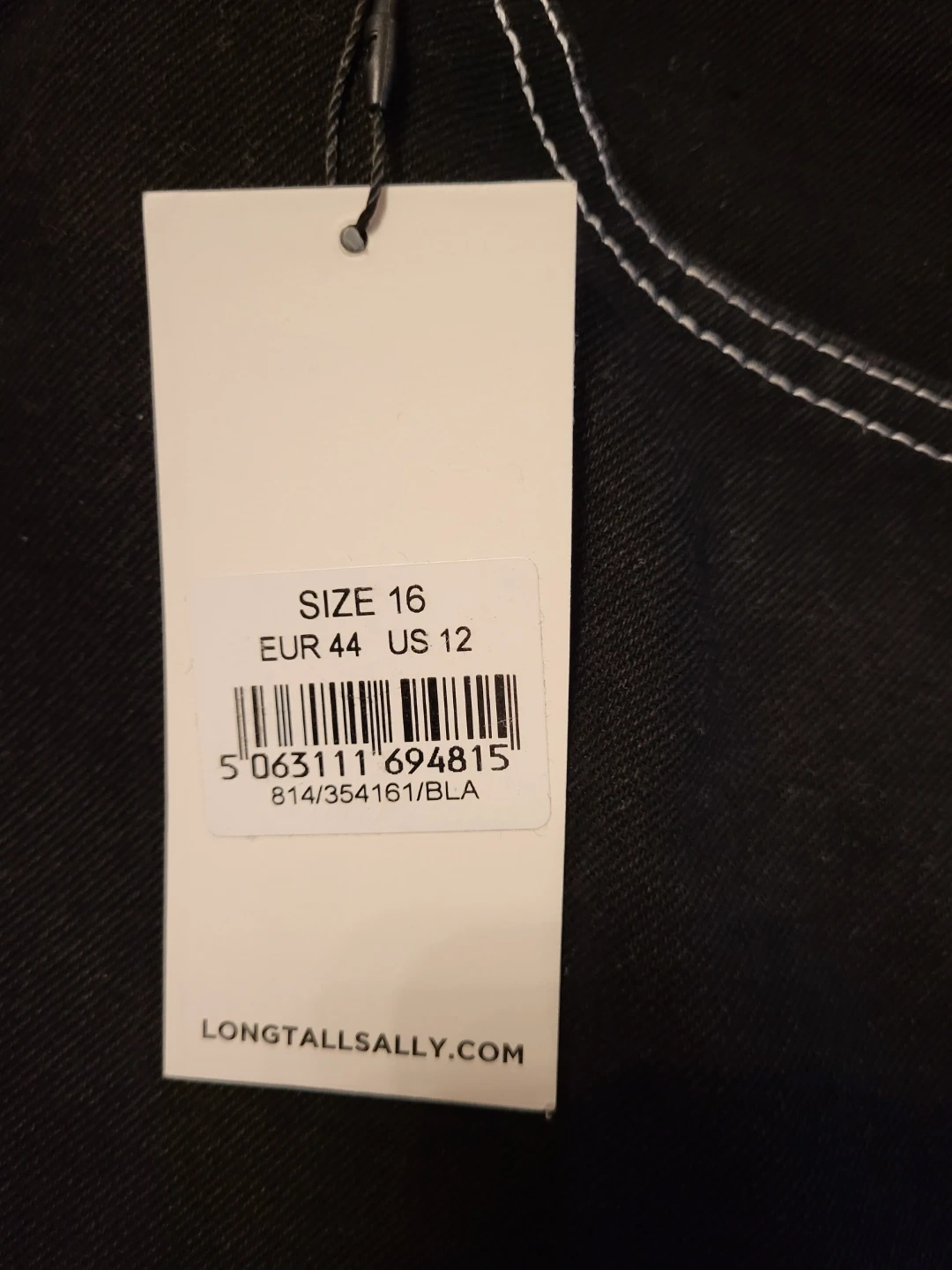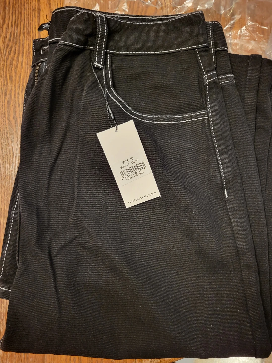 These are a pair of Long Tall Sally black wide leg jeans with contrast stitching! They are a US size 12 and have a 34" inside leg length. Perfect for adding a stylish touch to your wardrobe!