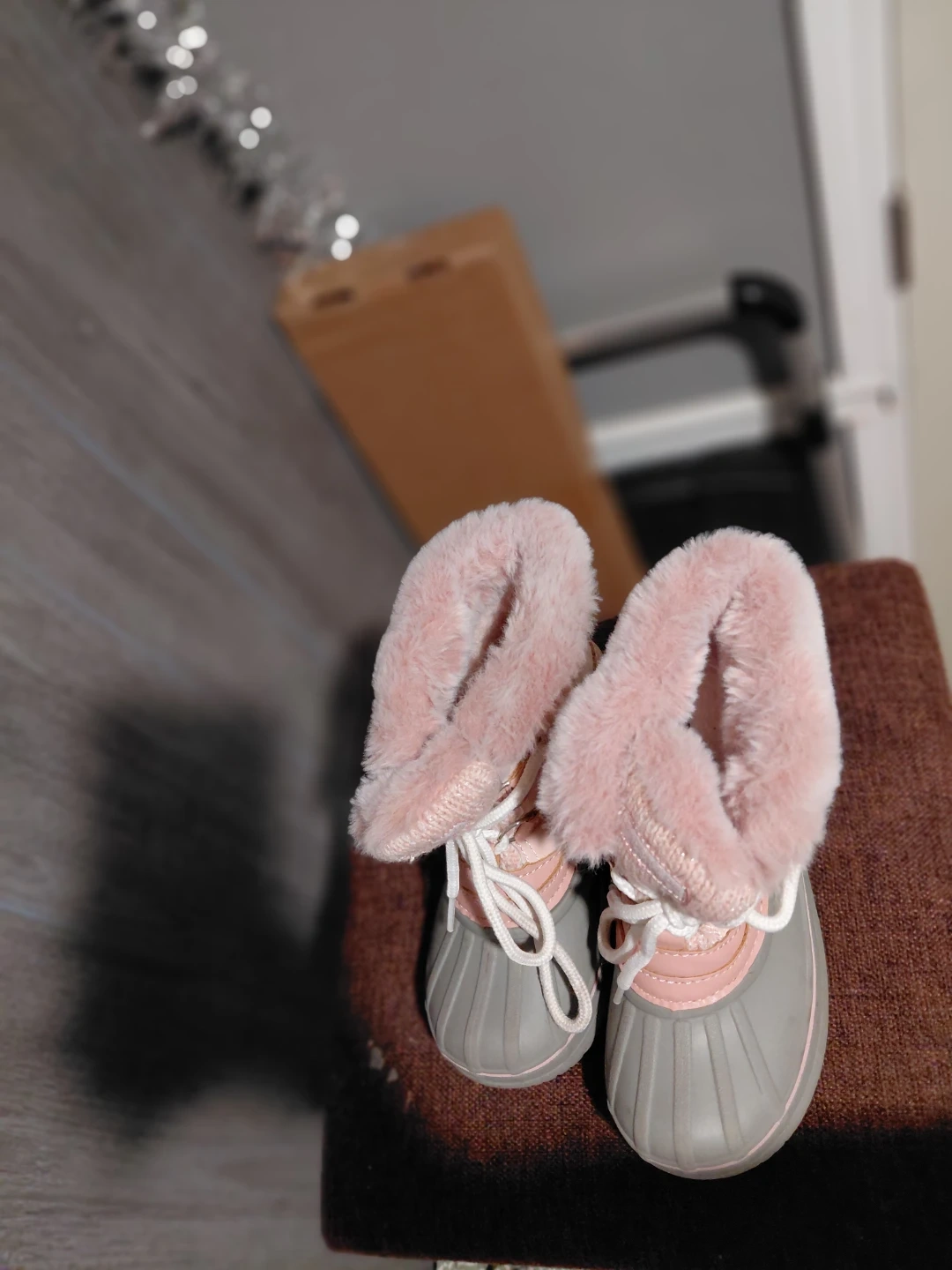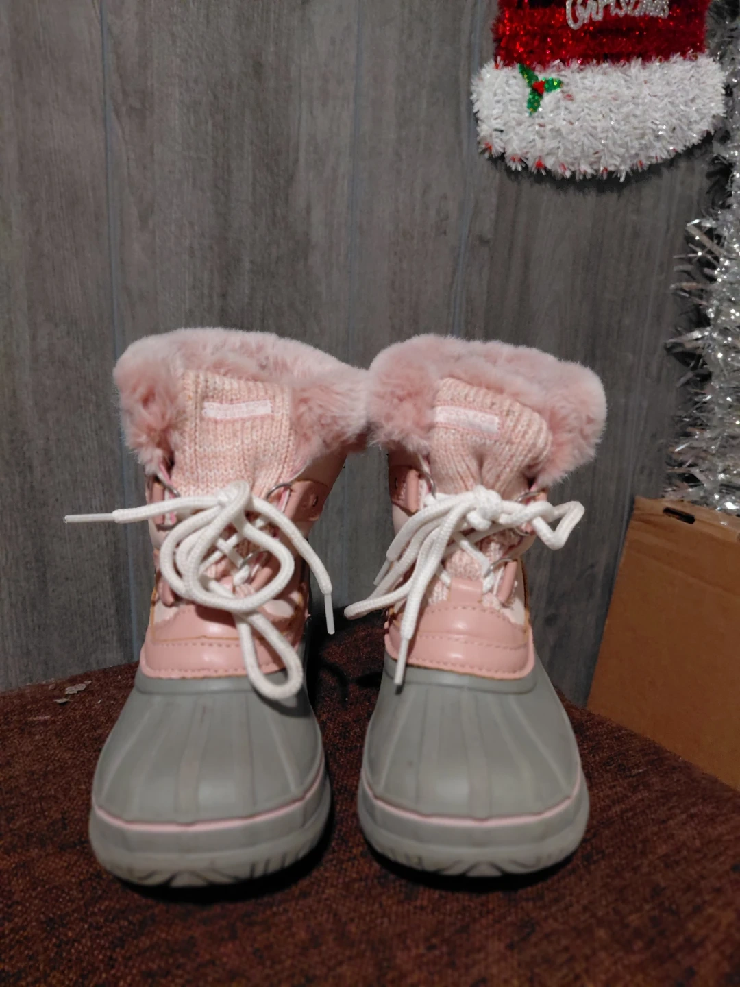 These adorable snow boots are perfect for keeping little feet warm and dry! They feature a cute pink and gray design with a cozy faux fur trim. Size 10.