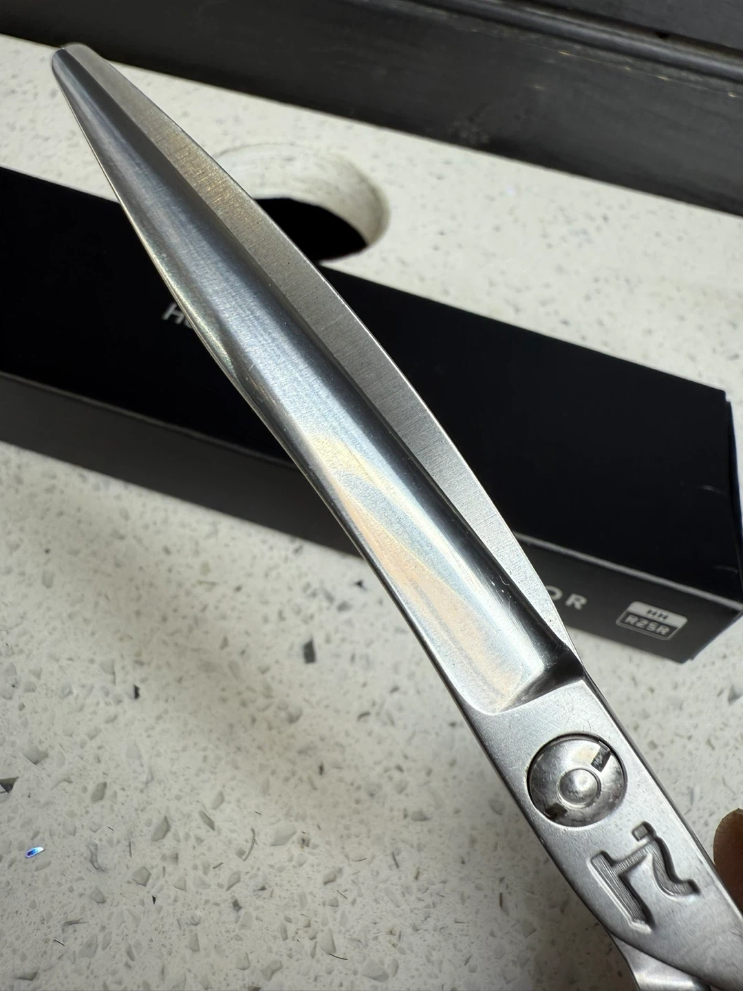 Like a high-end sports car, the Hattori Hanzo HHP Pai Mei will outperform almost every other shear on the market. Blends of cast or forged steels make up the composition of most shears. However, we utilize advanced production techniques in the creation of the Pai Mei. We construct each HHP from condensed microparticles of nano powder steel. The result is a scissor of unparalleled strength and cutting ability. The unique design of the Pai Mei boasts a nearly flat thumb blade with a rounded spine, combined with a curved cutting blade carrying a classic 800mm radius, creating a shear of extreme versatility and capability. Ideal for perimeter lines and bobs, the Pai Mei will cut a perfectly straight line through even the densest sections–saving the stylist precious time on every haircut.