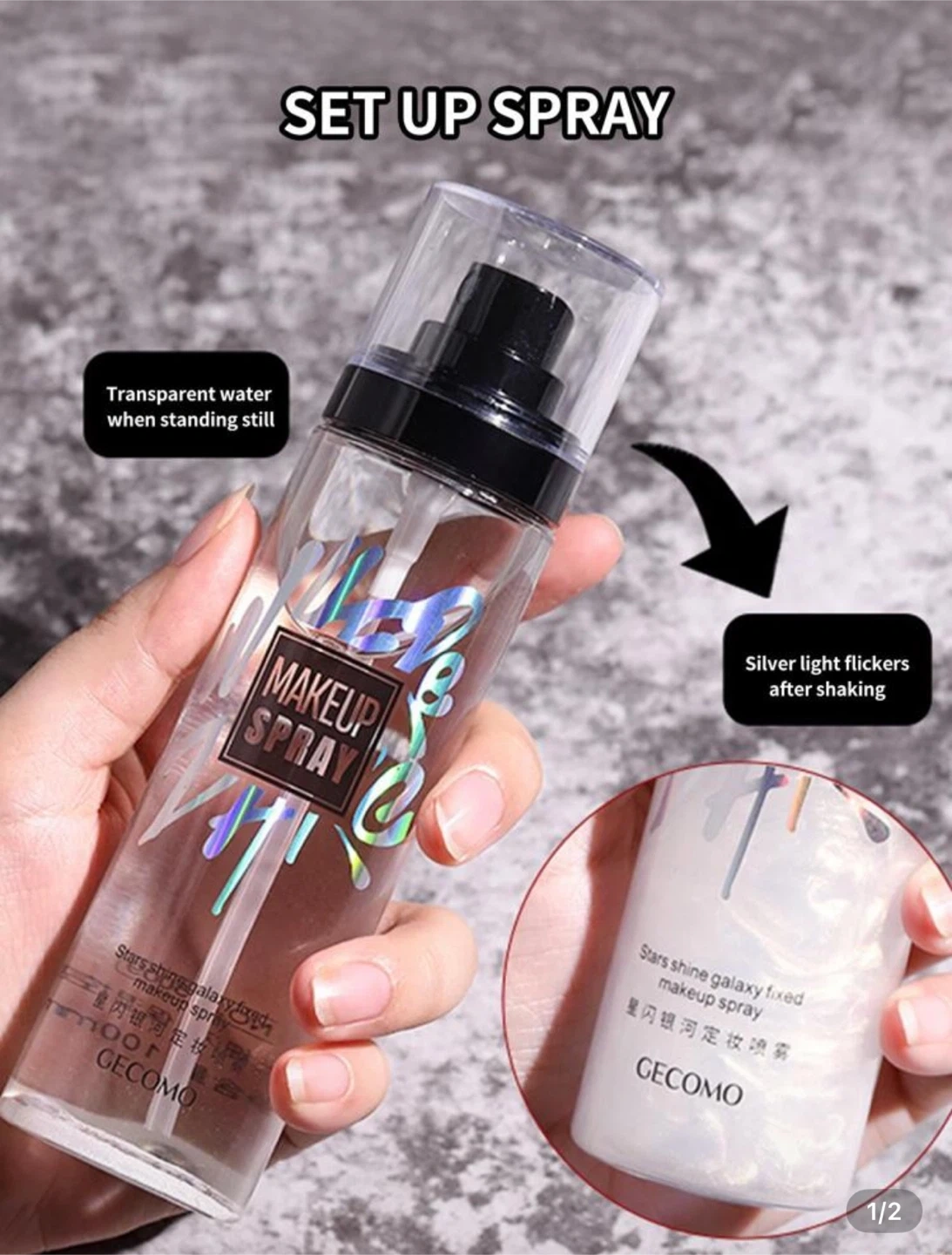 Selling a GECOMO makeup setting spray! It's a setup spray that provides a transparent water finish when standing still. When shaken, you'll notice silver light flickers. A great addition to your makeup routine!