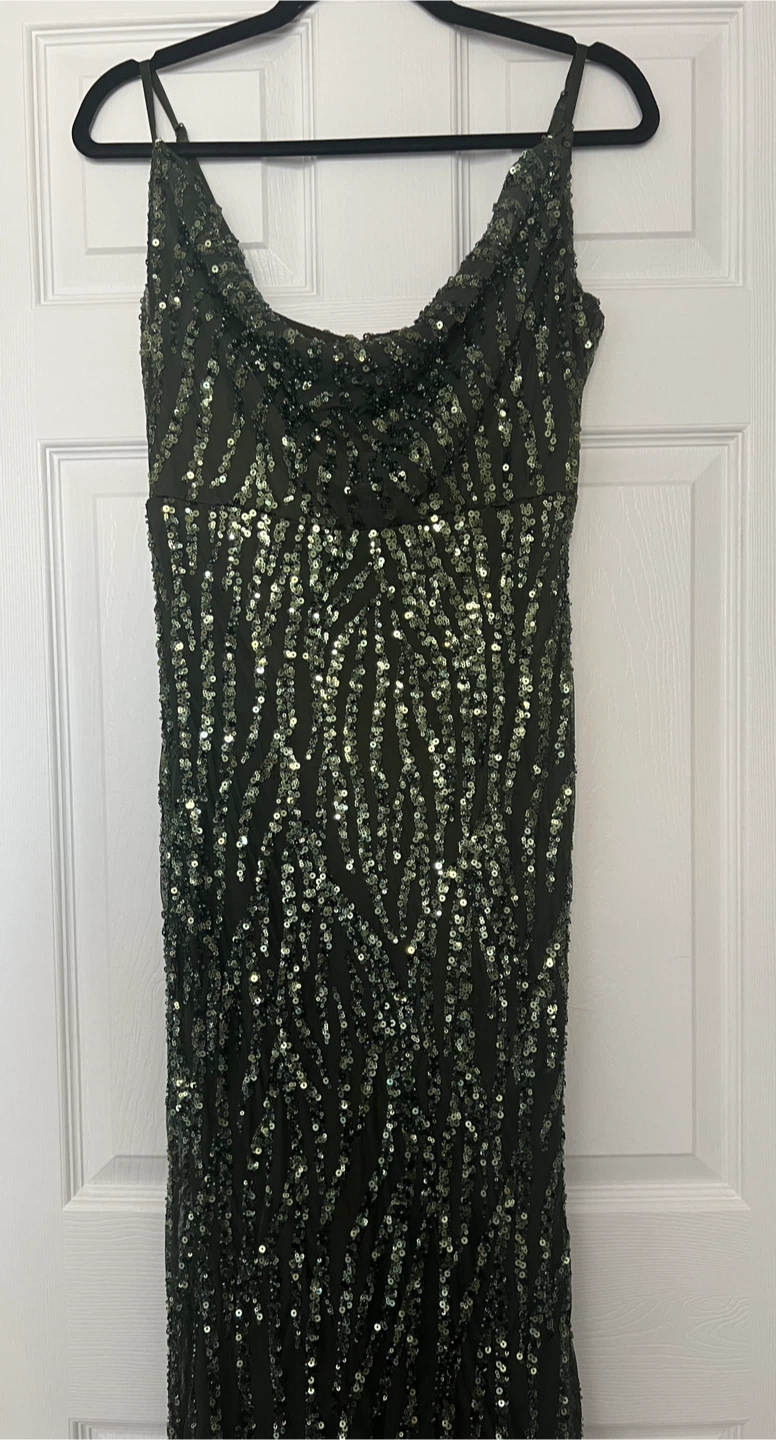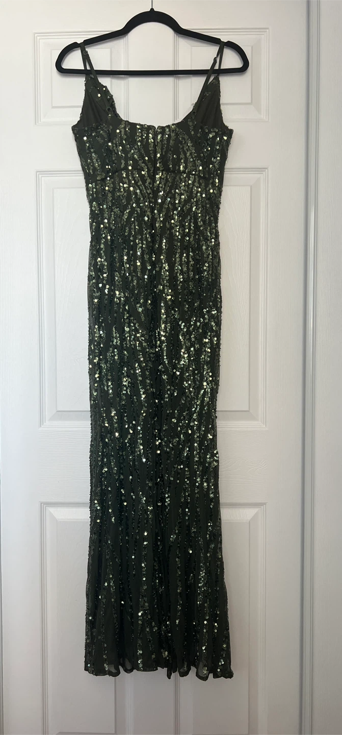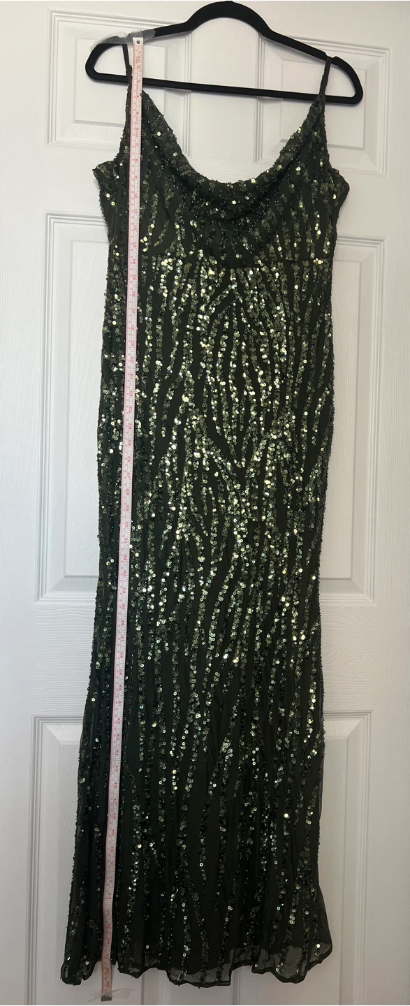 Worn once. This is a beautiful deep olive green dress with sequin embellishments and interior is lined. The size is M/M, but has stretch to fit a regular size Large with full C/D cup bra size and length fits floor length for someone who is approximately 5ft 2” in heels. Dress in excellent condition as it was only worn one time.