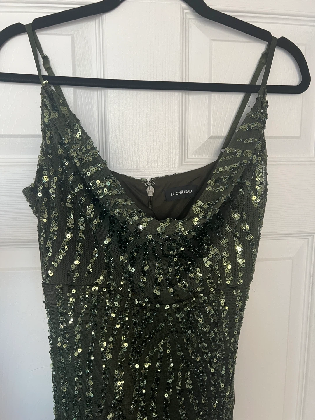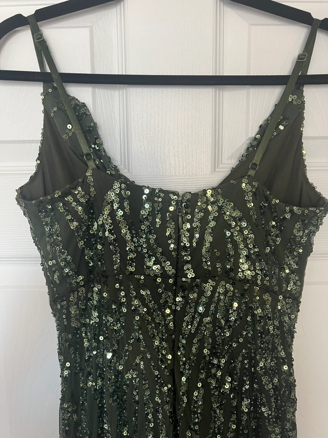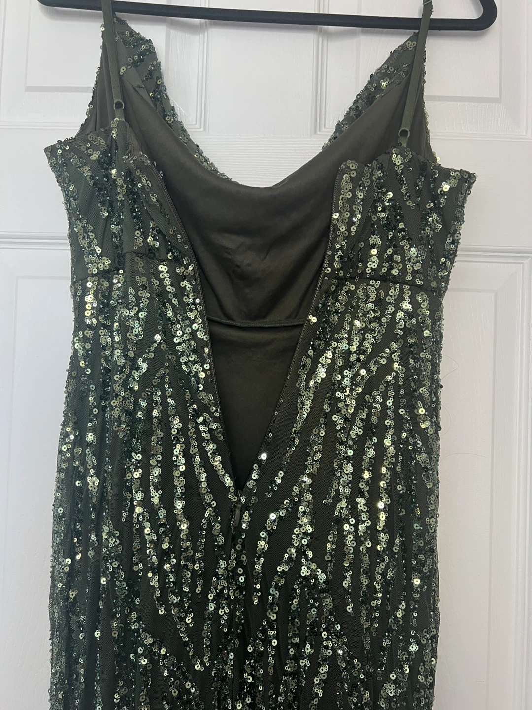 Worn once. This is a beautiful deep olive green dress with sequin embellishments and interior is lined. The size is M/M, but has stretch to fit a regular size Large with full C/D cup bra size and length fits floor length for someone who is approximately 5ft 2” in heels. Dress in excellent condition as it was only worn one time.