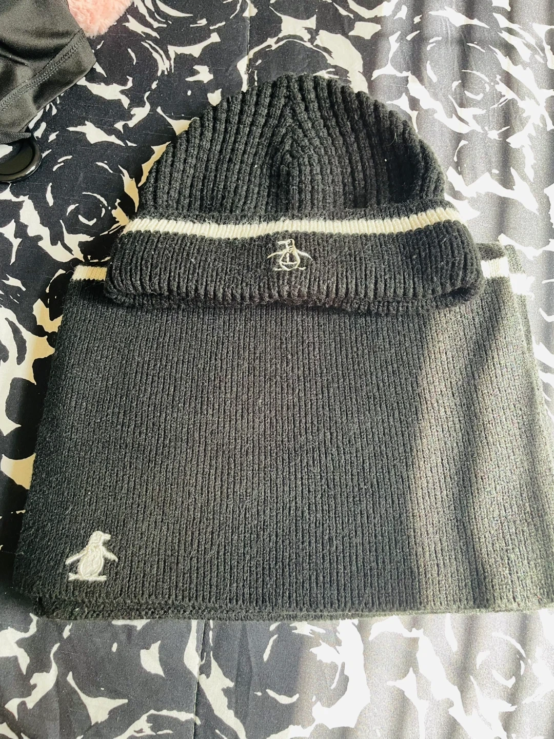 This is a black knit beanie and scarf set from Original Penguin. It features the brand's signature penguin logo embroidered on both items. Made from a warm, ribbed knit material.