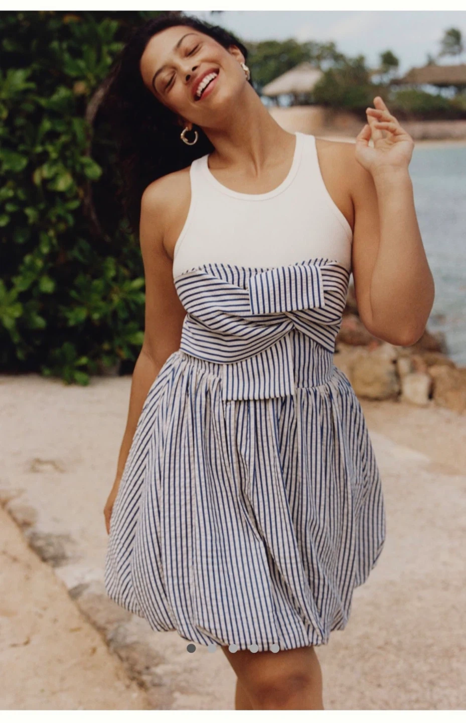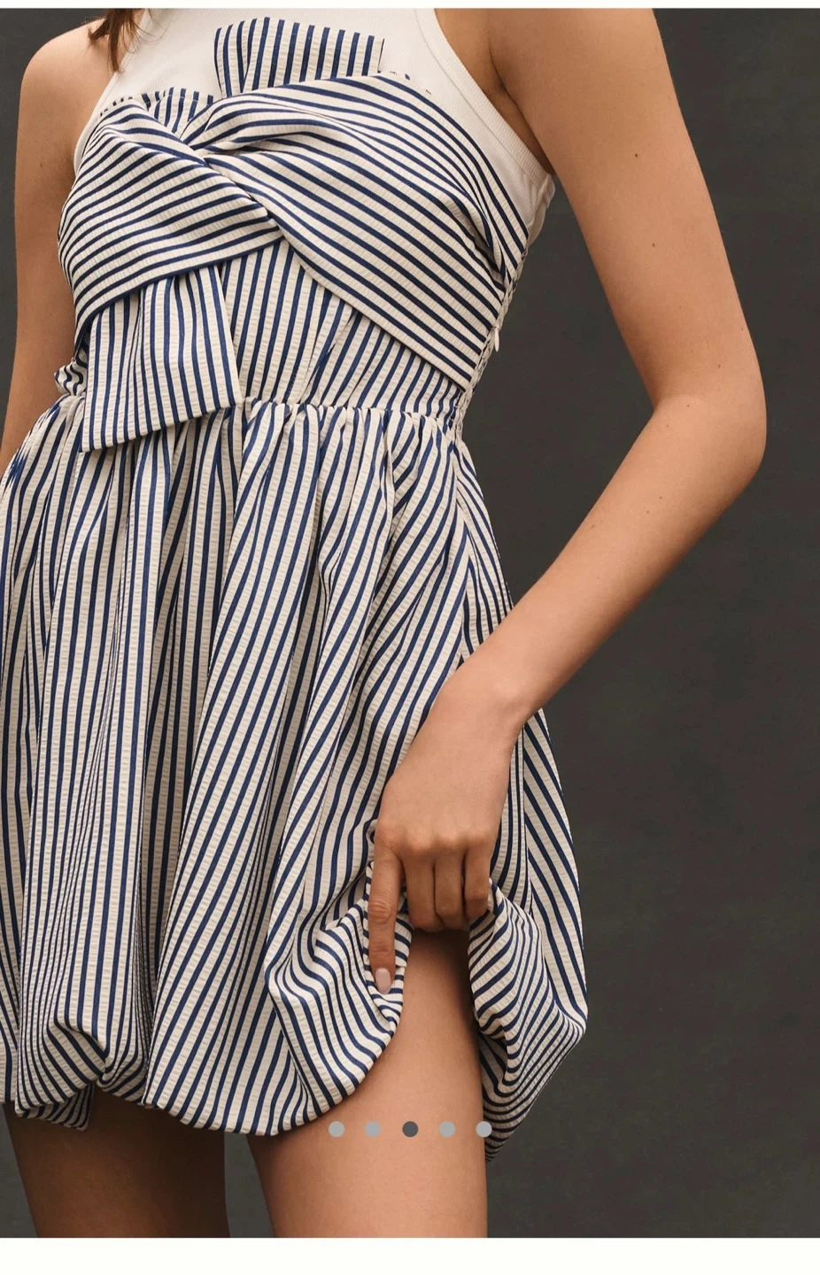 Sweet and summery mini dress with a white ribbed tank top and a blue and white striped bubble hem skirt. The bodice has a flattering knotted detail. This dress is perfect for warm weather days! . ACCEPTING OFFERS-AS LONG IS NOT A LOW BALL OFFER I WILL ACCEPT OR COUNTEROFFER.