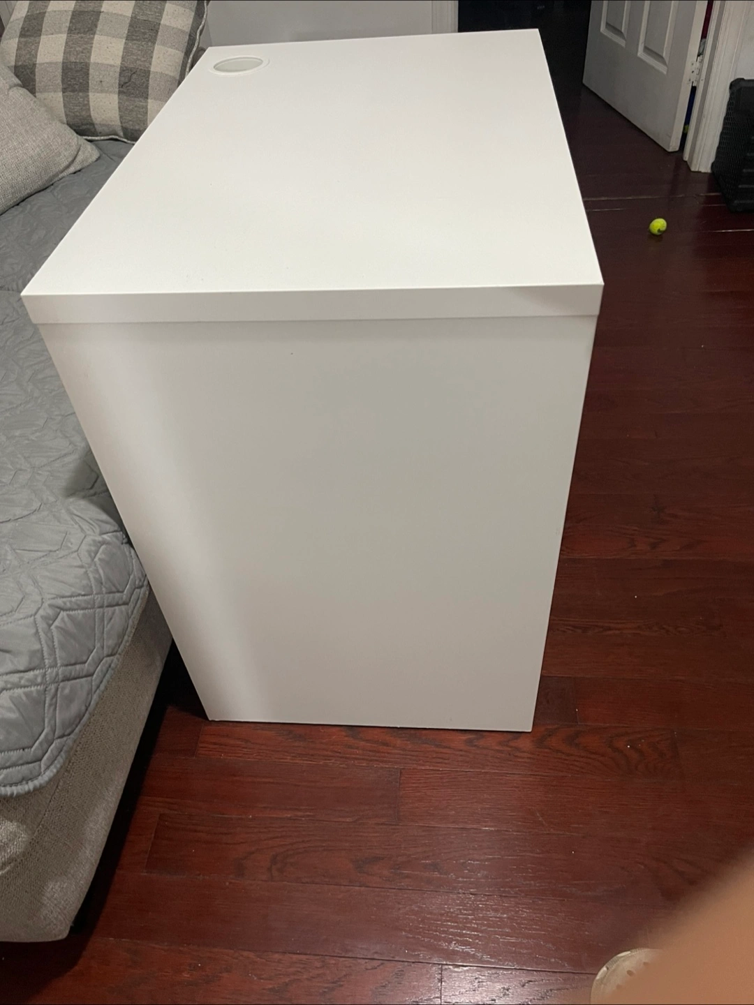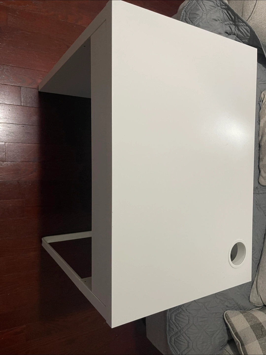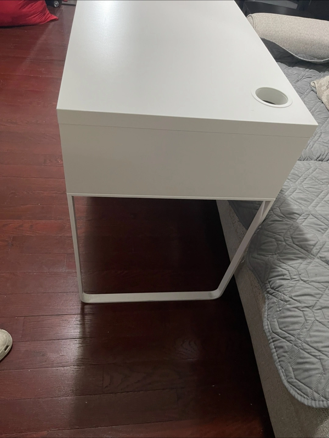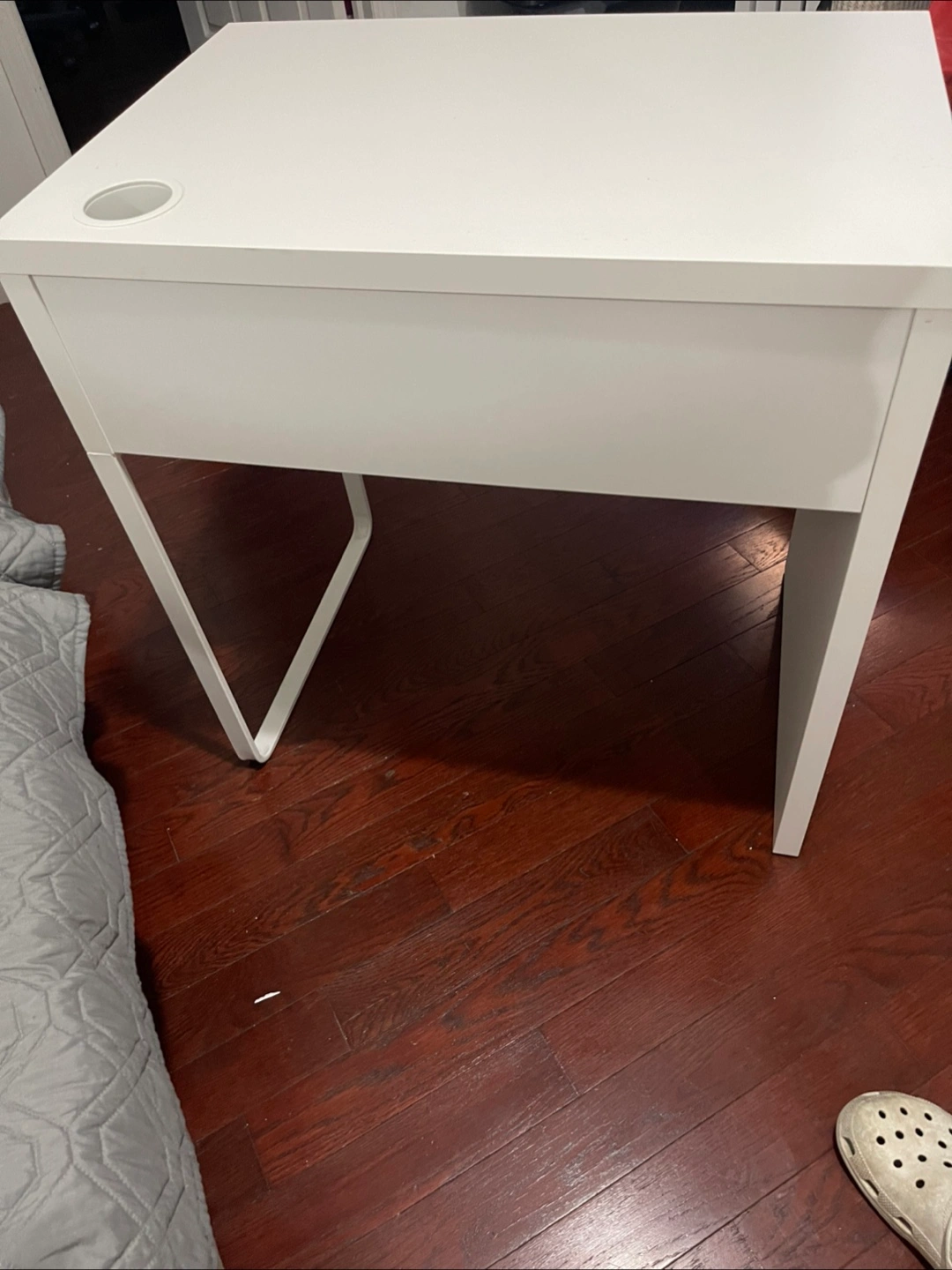 Here's a simple white desk with a drawer. It has a clean look and would be great for a small space or a home office setup! There's also a circular cutout on the top surface, perfect for holding a cup or small items