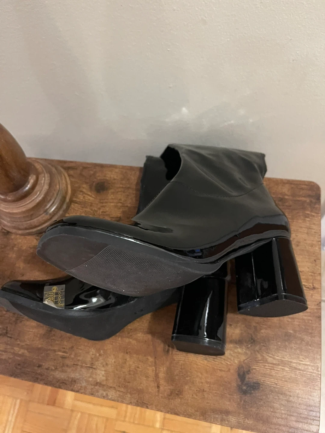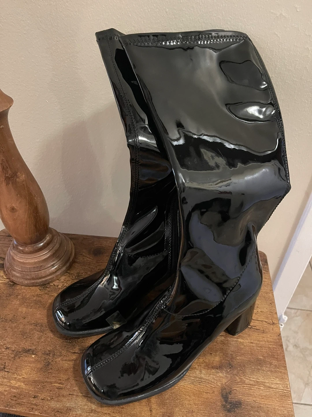 These are a pair of super stylish black patent leather knee high boots! They have a chunky heel and a side zipper. Perfect for adding a bit of edge to any outfit!