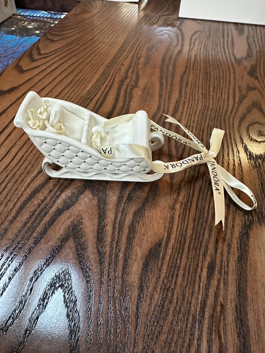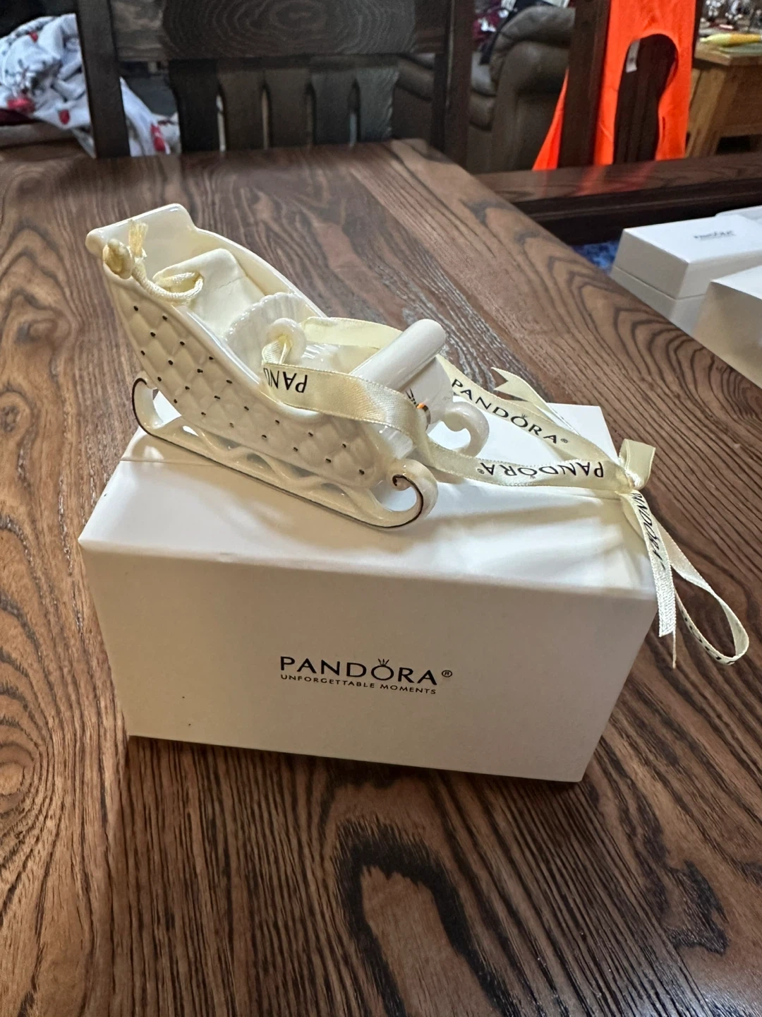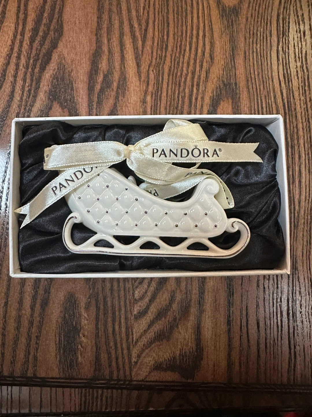 Selling a Pandora sleigh ornament with its original box, perfect for gifting or keeping it safe during the holidays! ln like new condition and ready to add a touch of elegance to your Christmas tree or holiday decor