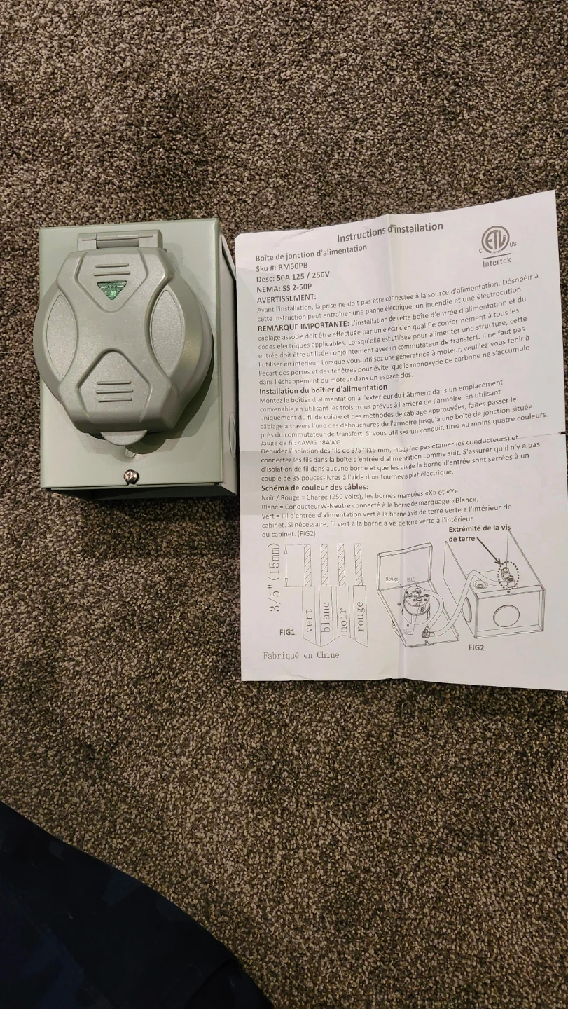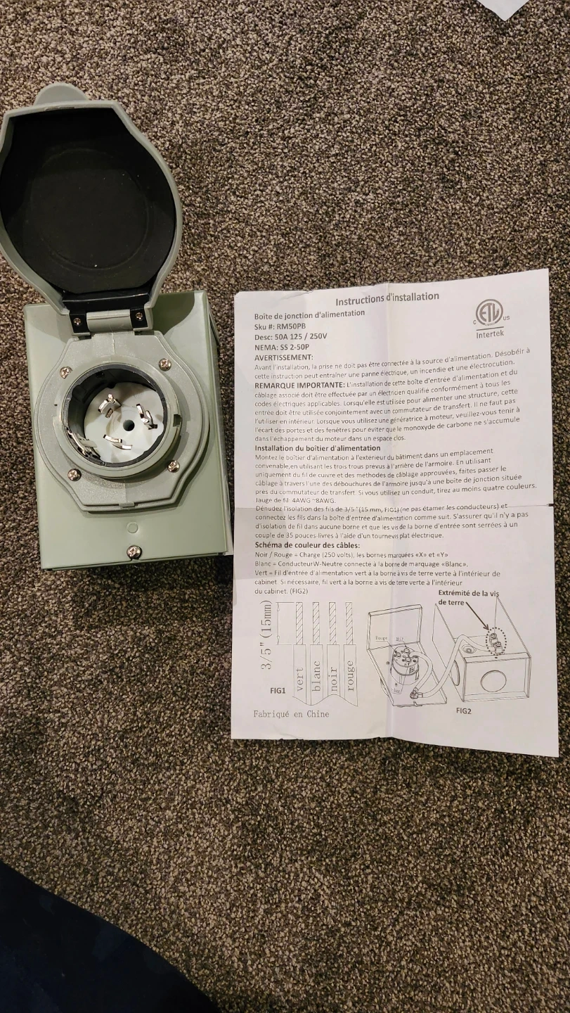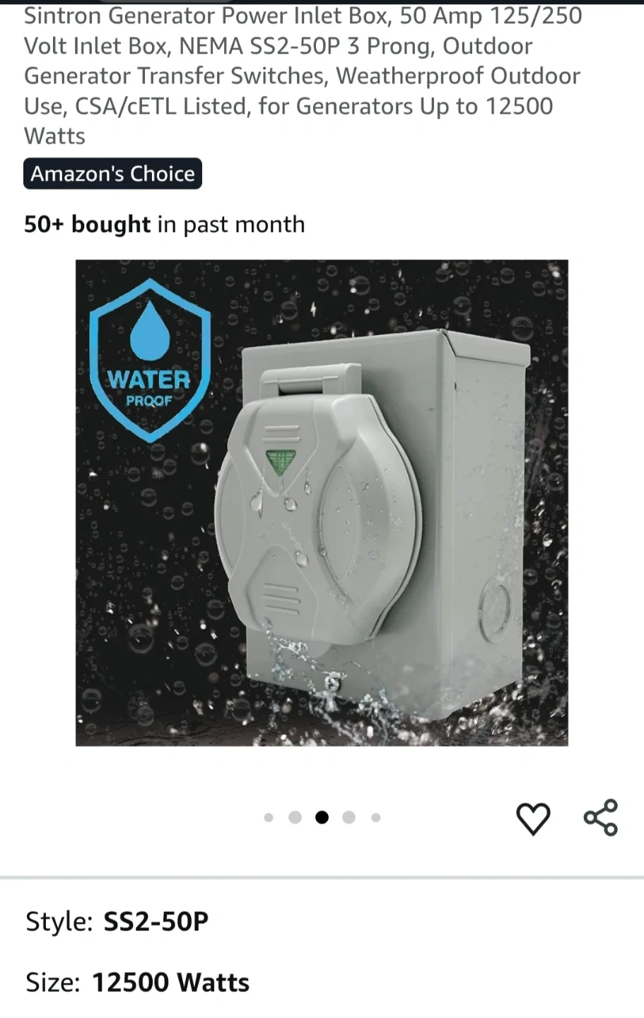 Selling a Sintron Generator Power Inlet Box, model SS2-50P. This is a 50 Amp 125/250 Volt inlet box. It's NEMA SS2-50P 3 Prong, suitable for outdoor generator transfer switches. It's weatherproof and CSA/cETL Listed, designed for generators up to 12500 Watts.